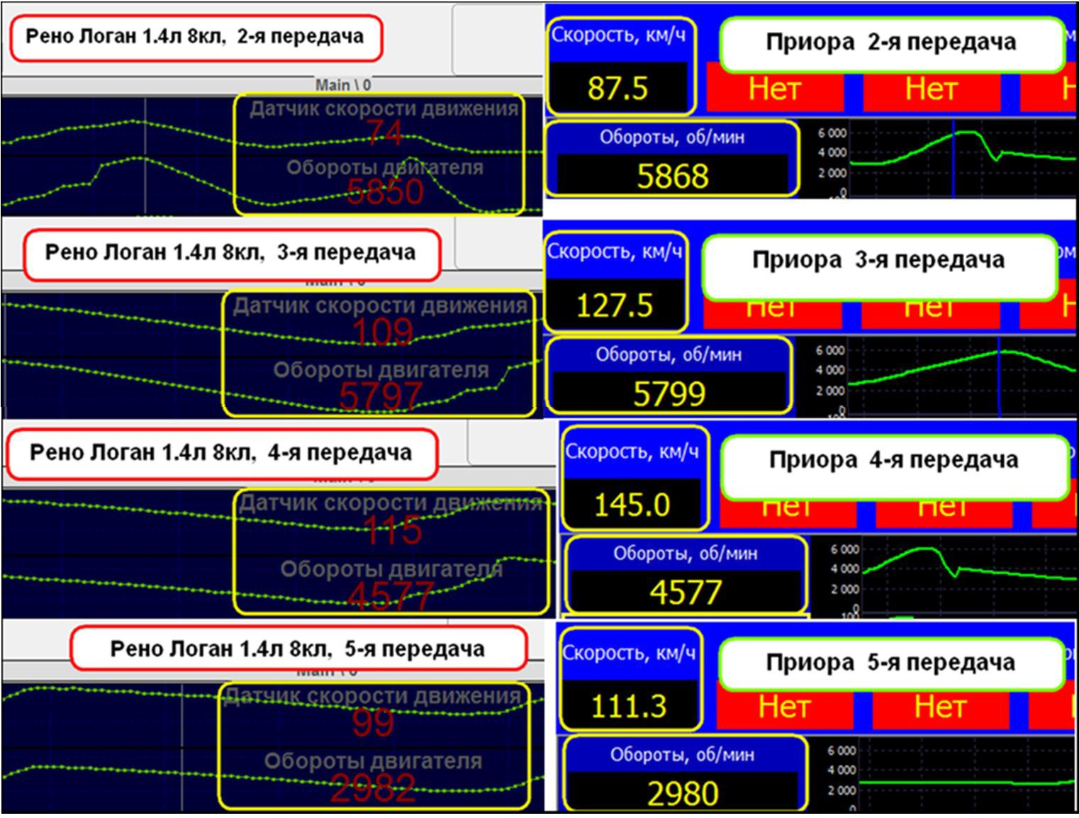 Посмотрим, какую скорость имеют Логан и Приора при равных оборотах двигателя: