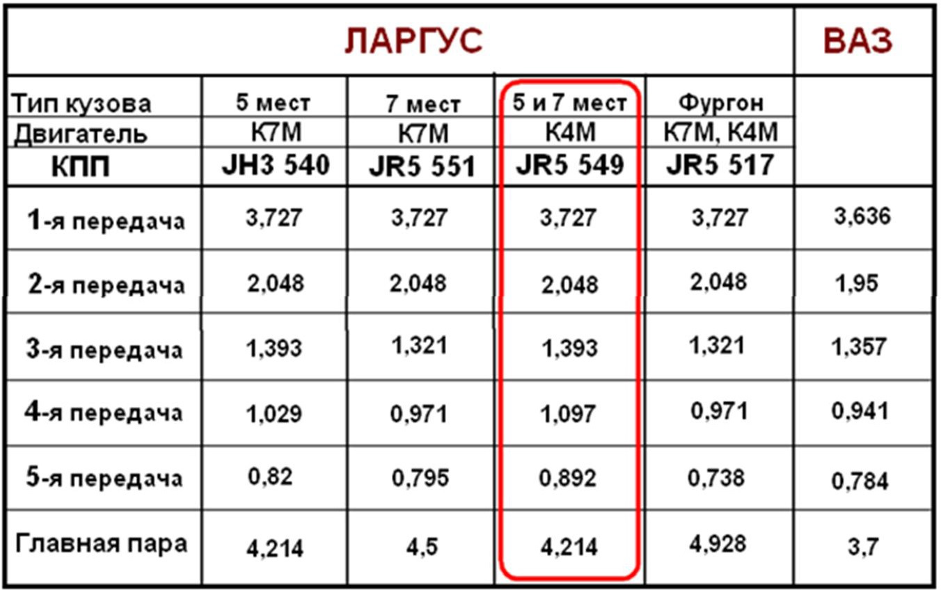 Таблица показывает разницу в передаточных числах КПП и ГП Ларгуса и ВАЗ (красным