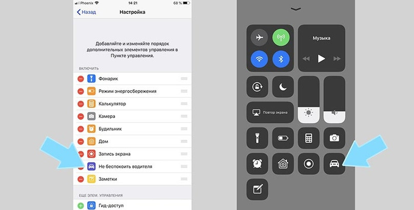 Для быстрого включения и отключения режима с автоответчиком будем использовать соответствующую кнопку из Пункта управления (добавляем по пути Настройки – Пункт управления – Настроить элем. управления – Не беспокоить водителя).