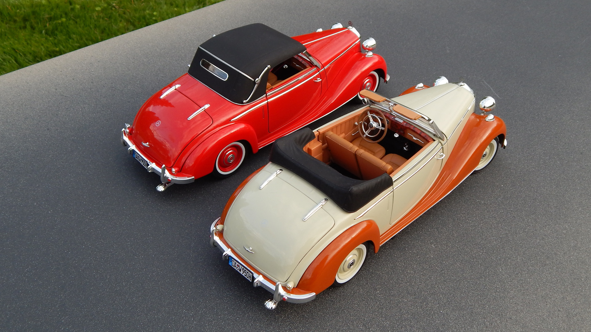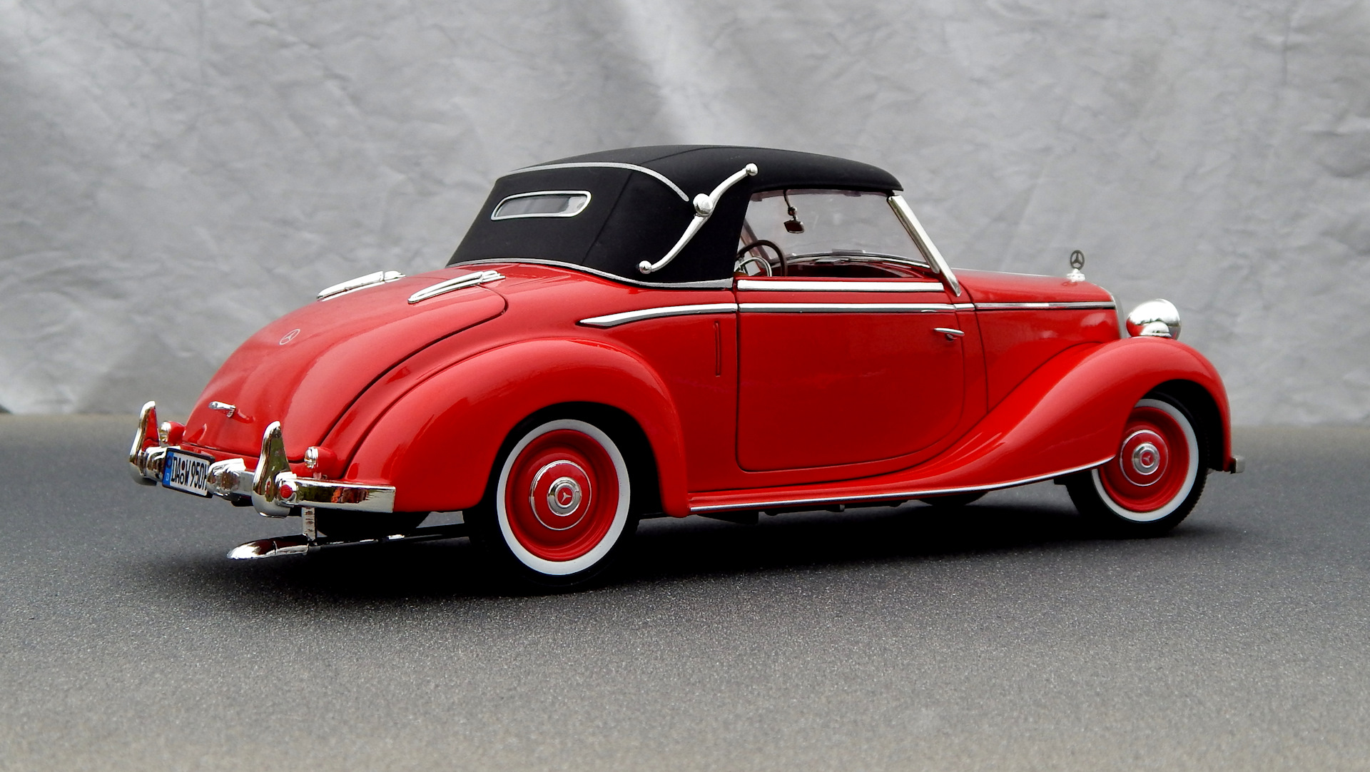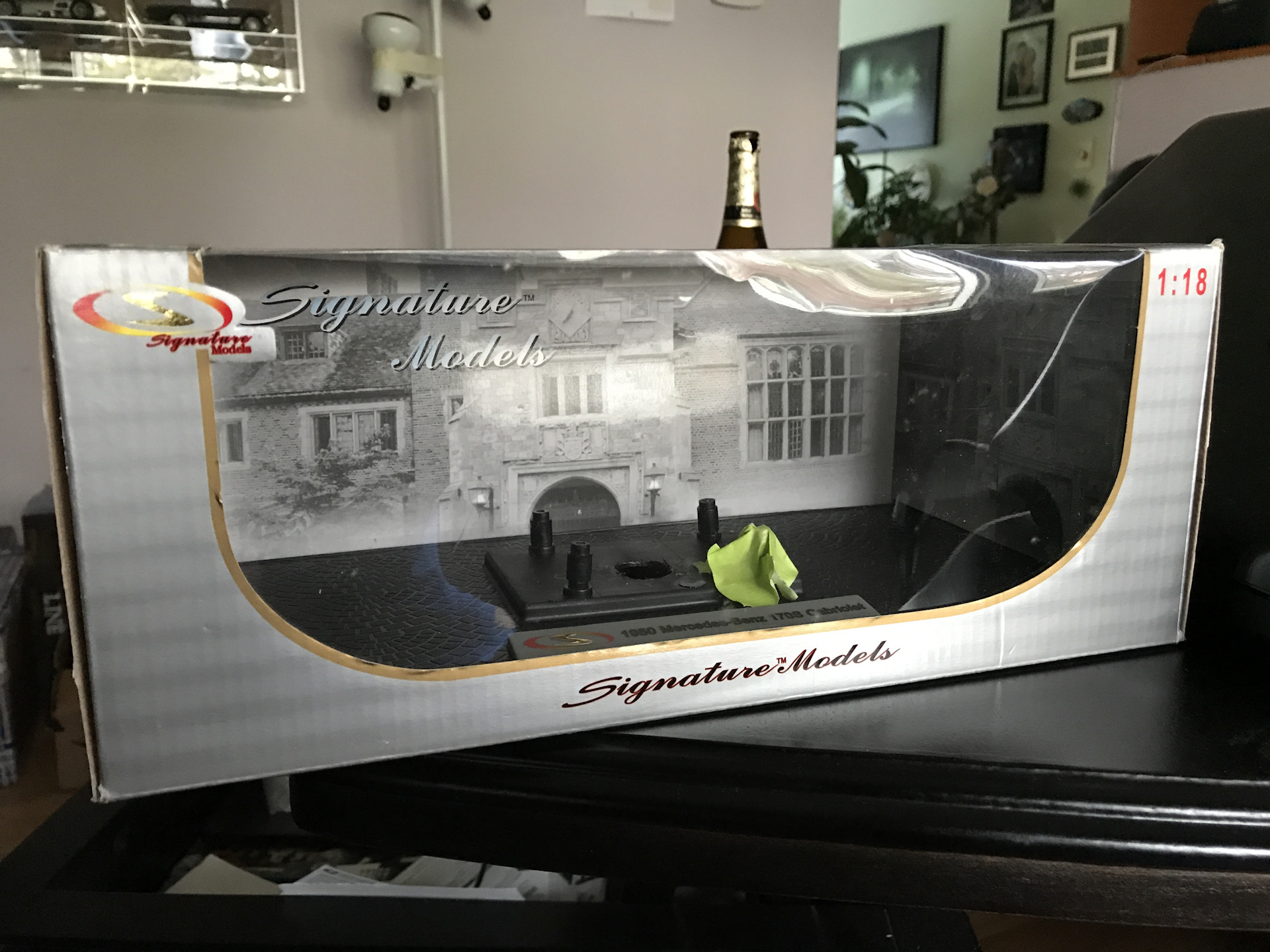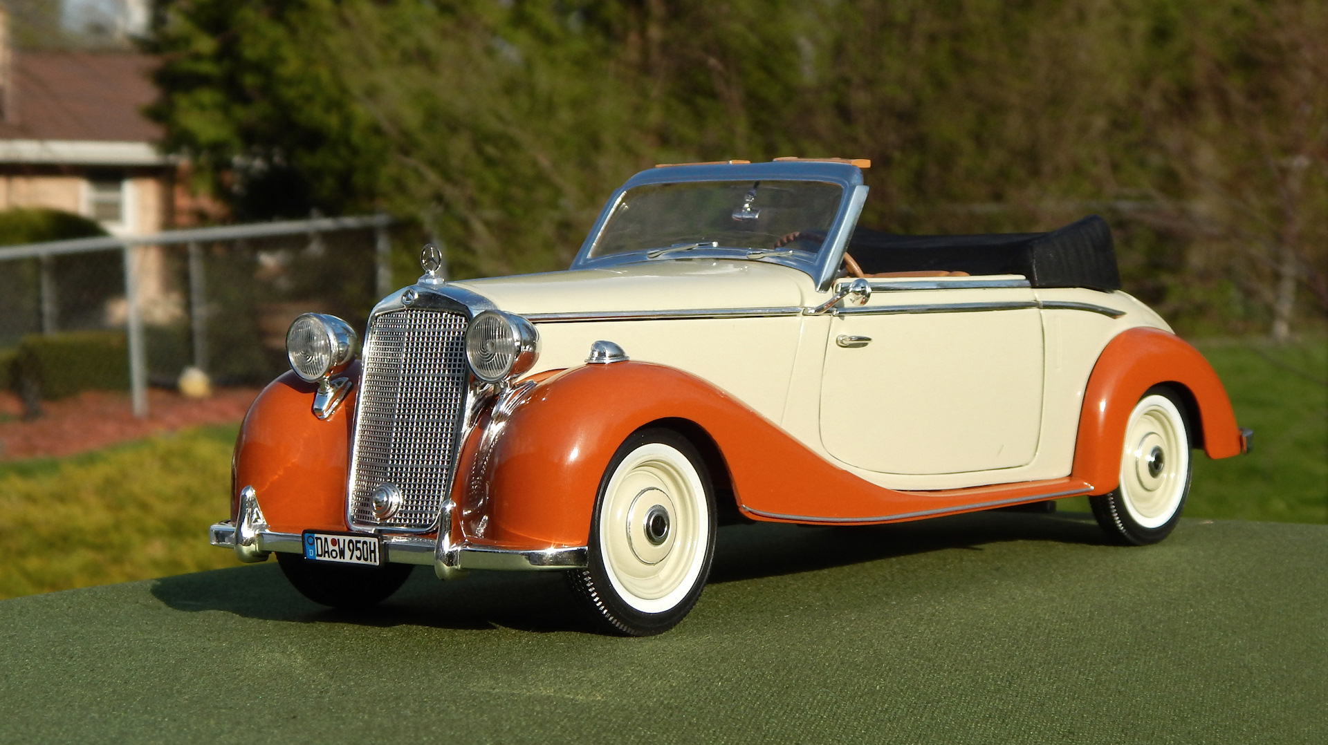 Представляю две модели от Сигначюр в двух цветах окраски. Сами модели неплохо смотрятся рядом с другими именитыми брендами. Если конечно не открывать. Облой на сиденьях и солнечных козырьках как на Шуко-портит впечатление. Но спасибо, что нет уже штырьков в фарах. А капот открывается чудненько — никаких петель не видно. Дверные петли(как и на других моделях этой компании) сделаны отменно! Флока нет, да его и не было на этой машине. А имитация резиновых ковриков неплохо изображена на пластике. Дверные панели очень недурно на мой взгляд, но вот цвет салона одинаковый у обоих вариантов. Имитация деревянной панели приборов выглядит достойно! Колёса не очень качественно прокрашены, а на запаску так лучше вообще не смотреть: она почему-то покрашена из рук вон плохо. Эмблема на багажнике нанесена краской — печалька:( Но посмотрите как здорово изображён рефлектор фар! 5+! Сначала я купил красную. Но она оказалась только с вариантом с расправленной крышей. а без крыши там сияют две щели — некрасиво :( Начал смотреть другие модели в продаже и оказалось, что из 15-ти предложений только две имеют оба варианта крыши: и сложенный и расправленный. Пришлось рокупать ещё одну модель. А сейчас вроде как и жалко продавать первую — 30$ погоды не делают. На последней фото два Мерседеса: 170V from BoS and170S from Signature