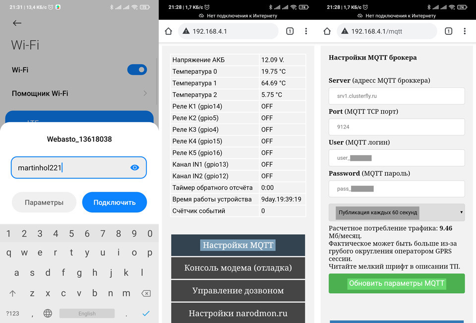 Для первичных настроек логинов и паролей, тестов, диагностики и обновления прошивки через веб страницу 192.168.4.1, которая откроется сразу после подключения к сети Webasto_XXXXXX с паролем martinhol221
