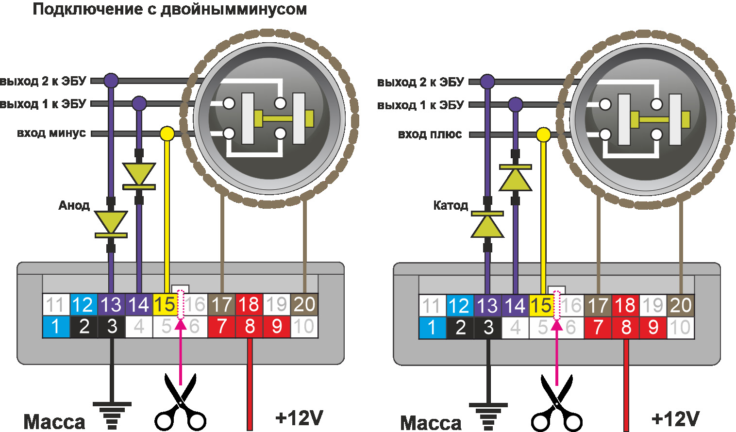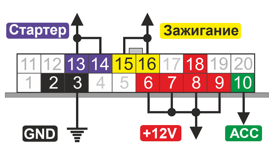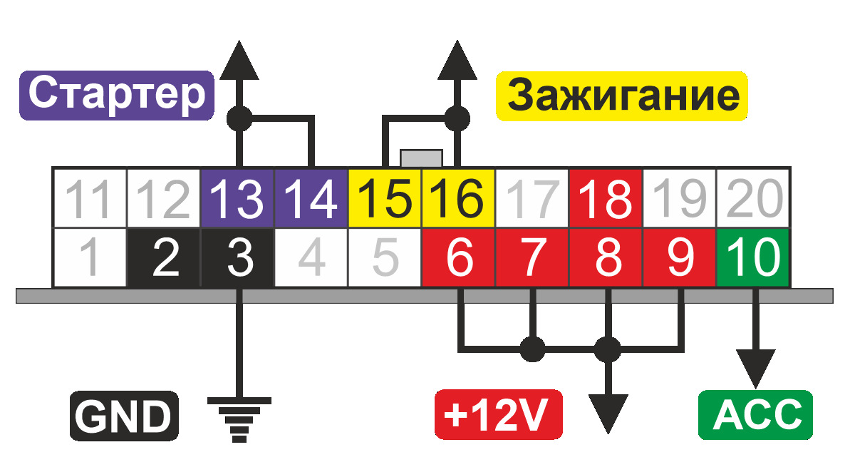 К1 – потребители, ACC, обманка педали тормоза, обманка сигнализации, Webasto, управление кнопкой ЦЗ (задается в прошивке)