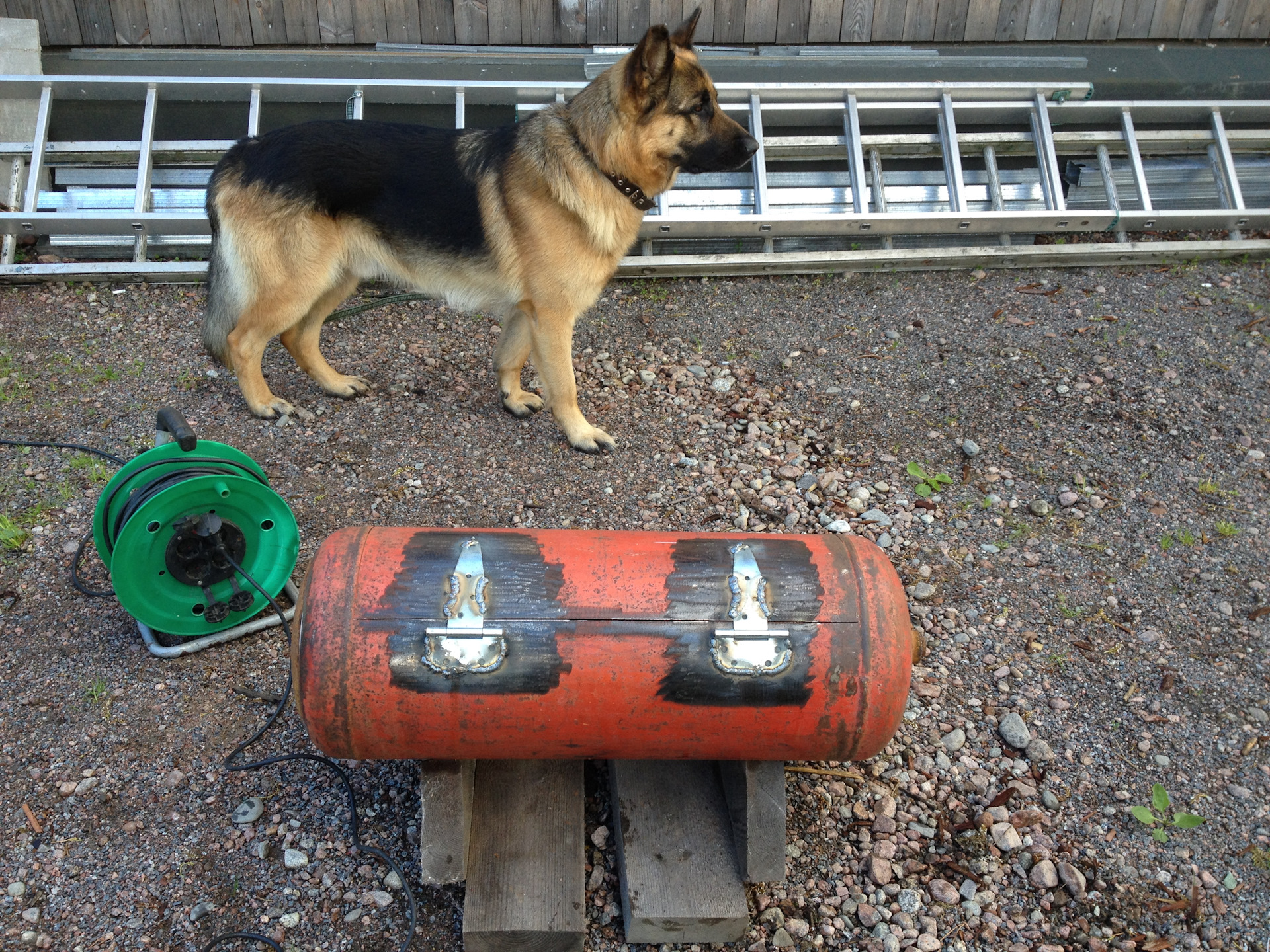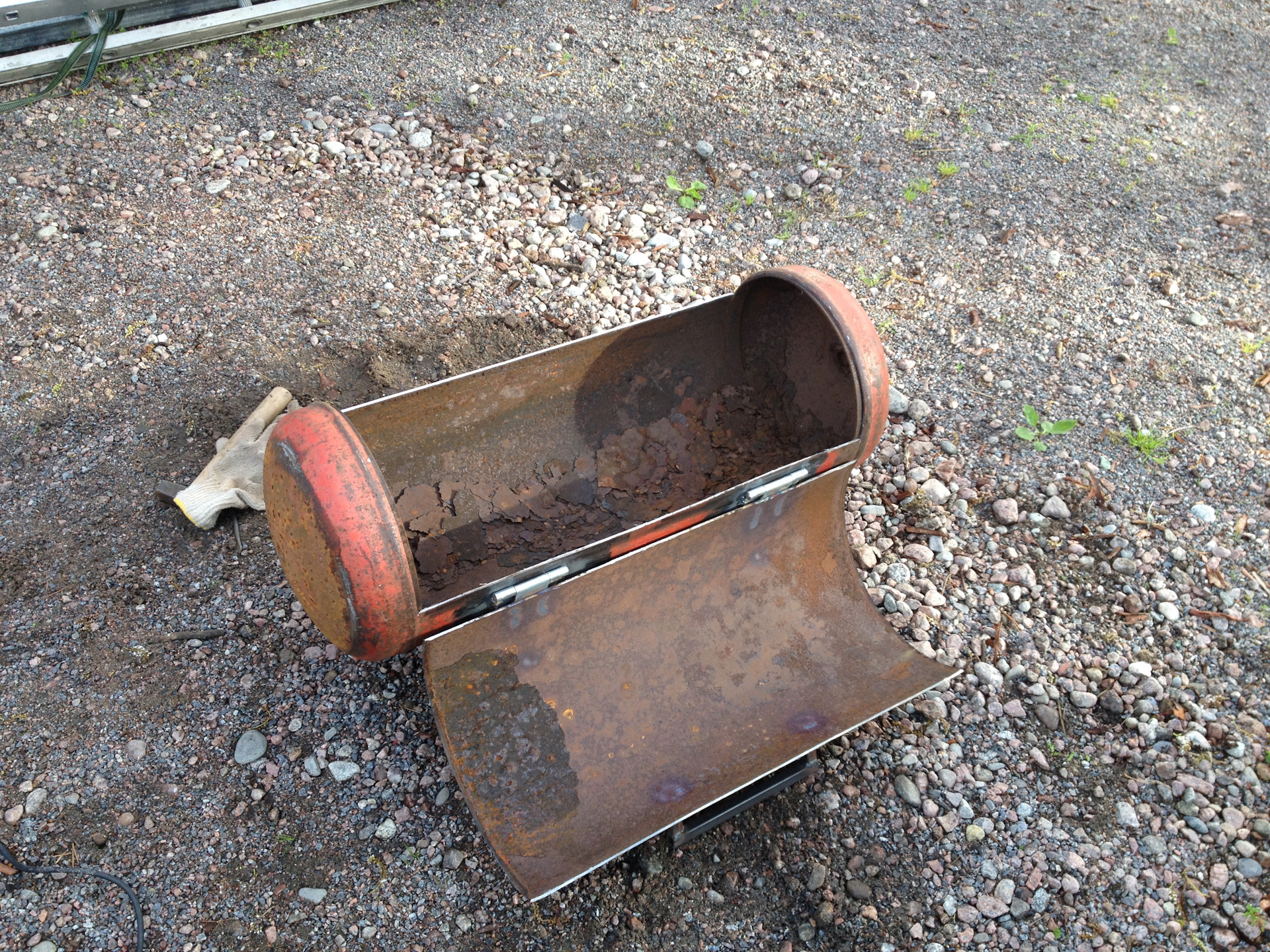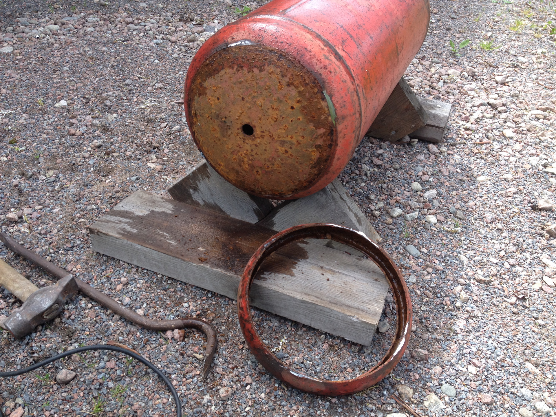 Итак, имеем баллон. Положил его на подставки для обработки бруса. Срезал обруч-подставку, разметил и сделал 2 реза по линии петель и лицевой. С боков пока не стал резать. Зачистил краску кругом в местах сварки. На улице периодические дожди. Поэтому, в гараже настелил на пол куски двп и фанеры. Они у меня специально для сварочных дел. Огородил место, чтобы искры не летели куда попало. Приварил петли, которые по хозяйски были куплены заранее. Из обрезков проф. трубы 15х15 сделал ручку, приварил и вынес на улицу. Разметил боковые резы и резанул. Открыл крышку уже не баллона, а будущего мангала-гриль.