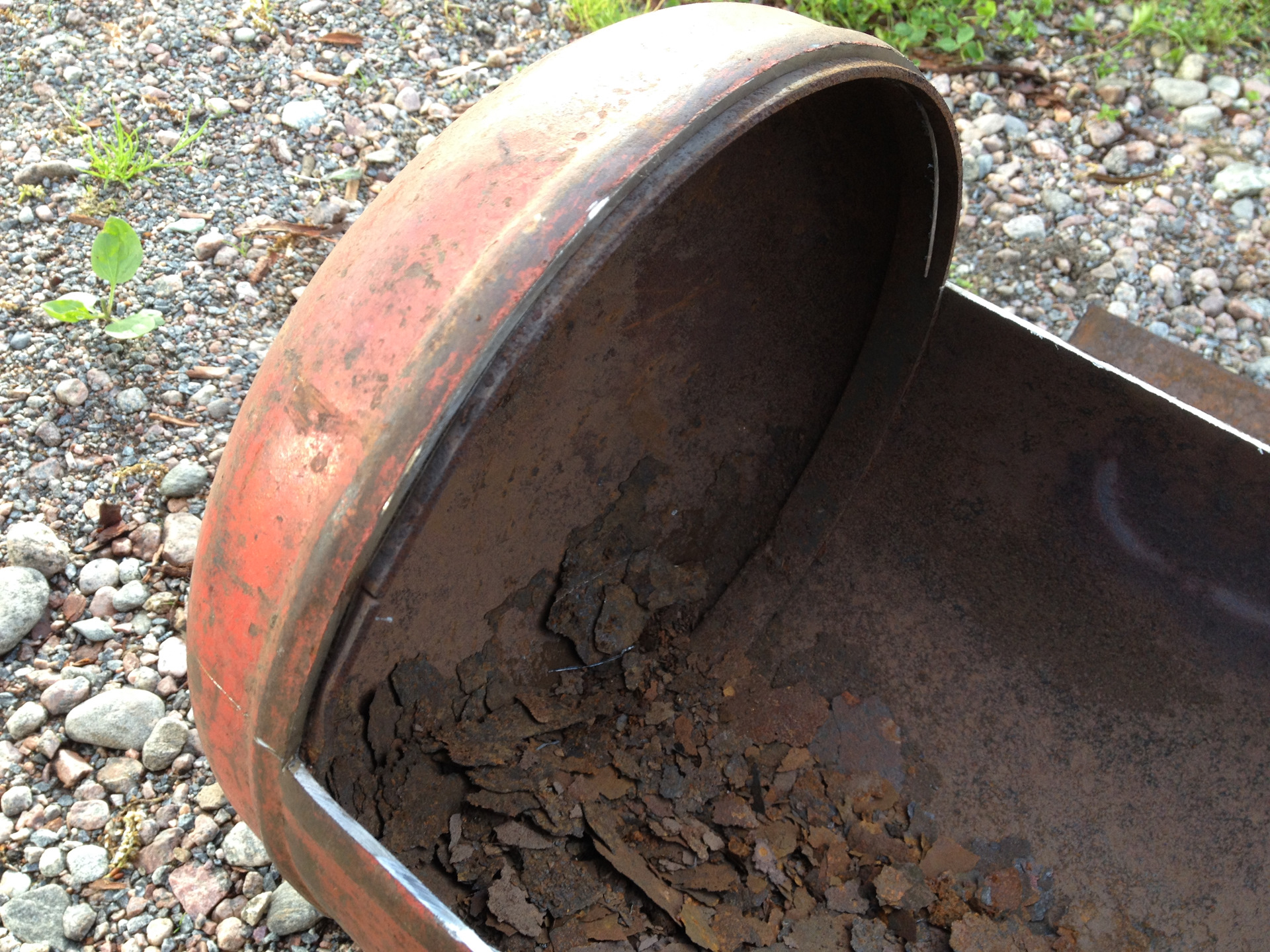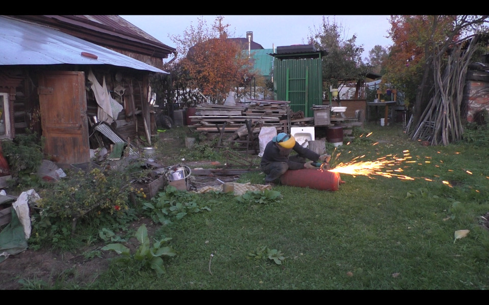 Прошлым летом спилил вентиль, просверлил отверстие в дне и залил водой. Вентиль срезал ножовкой по металлу, поливая водой место распила. Баллон оказался до того старый, что вентиль на нём стоял стальной. Отверстие сверлил тоже очень аккуратно, на малых оборотах и постоянно поливал водой сверло. Всю осень баллон стоял с водой, а на зиму я её слил.