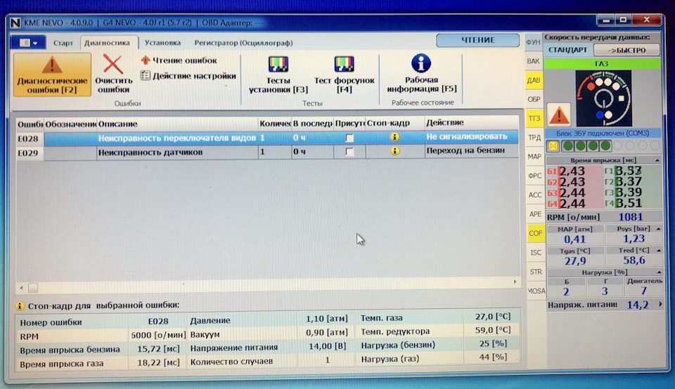 Гбо 4 поколения. Система kme nevo.При резком разгоне в районе 2500 оборотов, отключается газ и вылезают ошибки e028 и e029. С чем может быть связано? Если не крутить до 2500 машина едет хорошо.