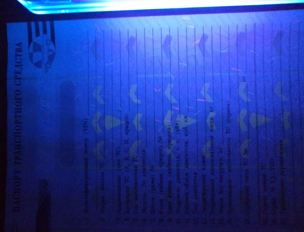 Ультрафиолетовый фонарь поможет проверить свечение нитей (волокон) «вживленных» в бланк ПТС. В бланке используются хаотично расположенные нити трех цветов. Свечение нитей должно быть ярким. На первой страницы ПТС есть узор, проявляющийся в ультрафиолетовом свете, а на третьей странице крупная надпись «ГИБДД», выполненная вертикально, но это возможно увидеть только с очень мощным ультрафиолетовым фонарём.