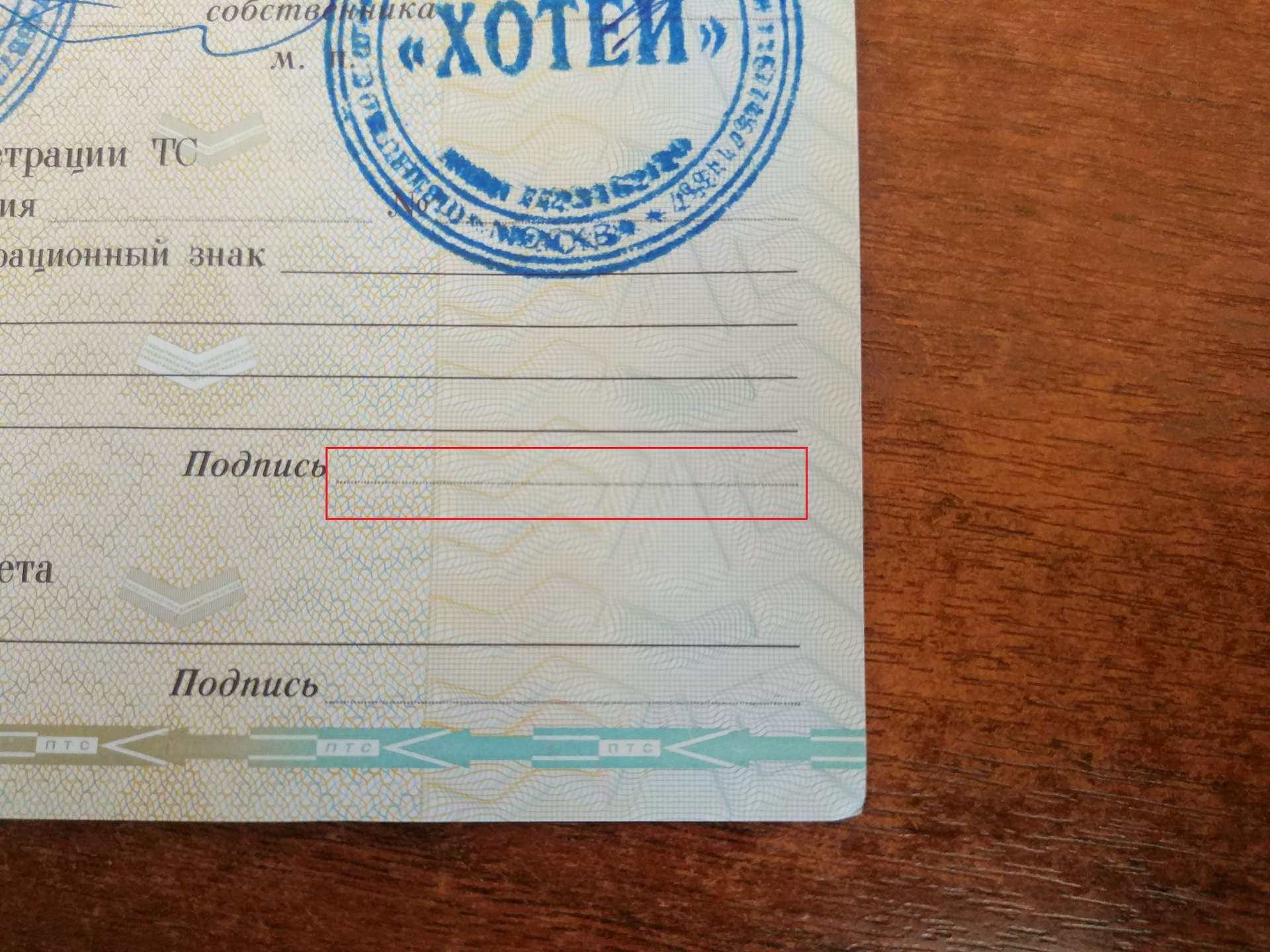 Карманный микроскоп поможет заметить, что некоторые разделяющие линии между строк данных на первой странице ПТС, а также линия после слова «подпись» — это микротекст, неразрывная надпись «паспорттранспортногосредства».