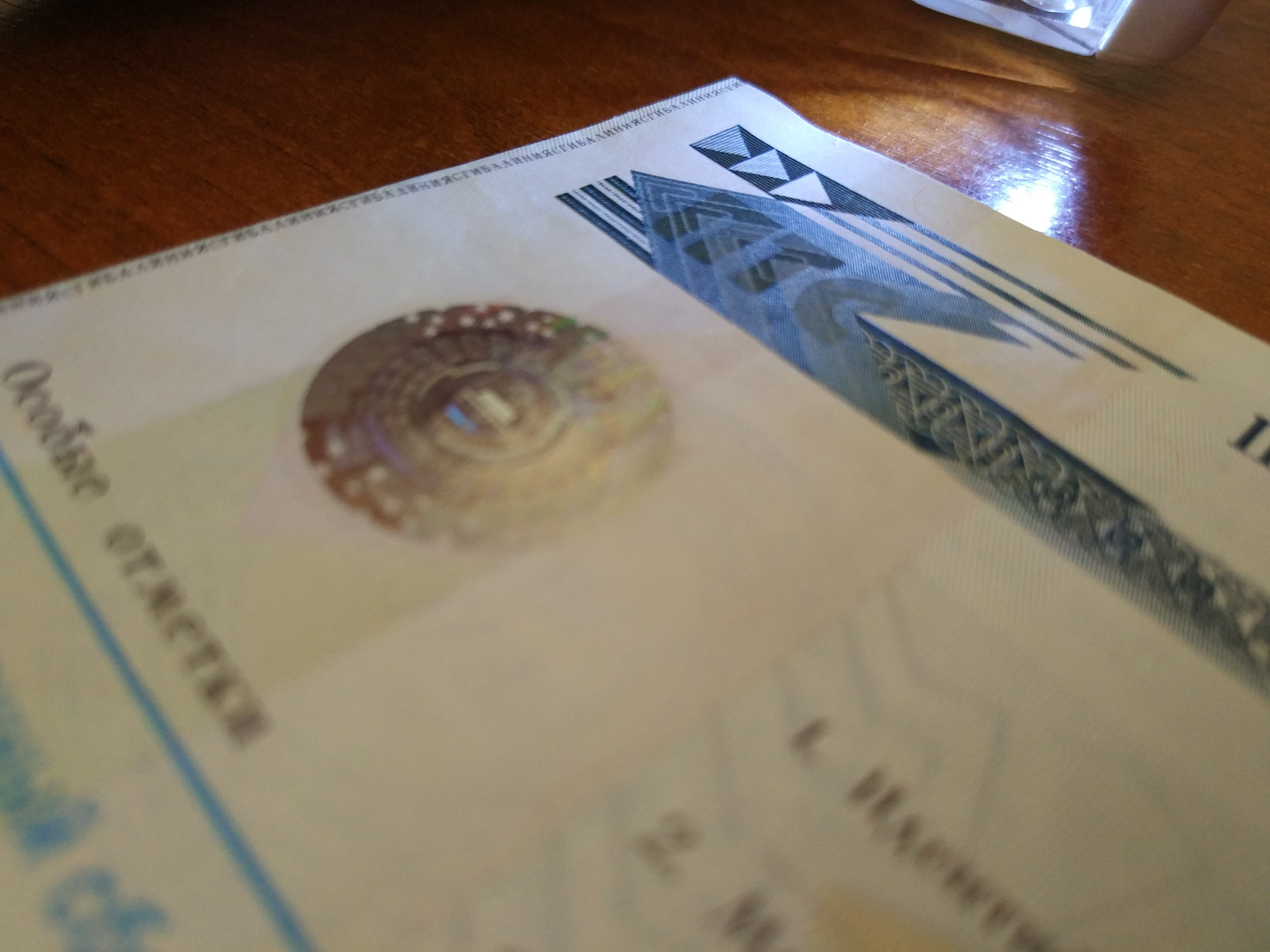На бланках старого образца, которые также являются действительными, голограмма выполнена в виде прерывистой линии и расположена на первой странице вдоль линии сгиба.