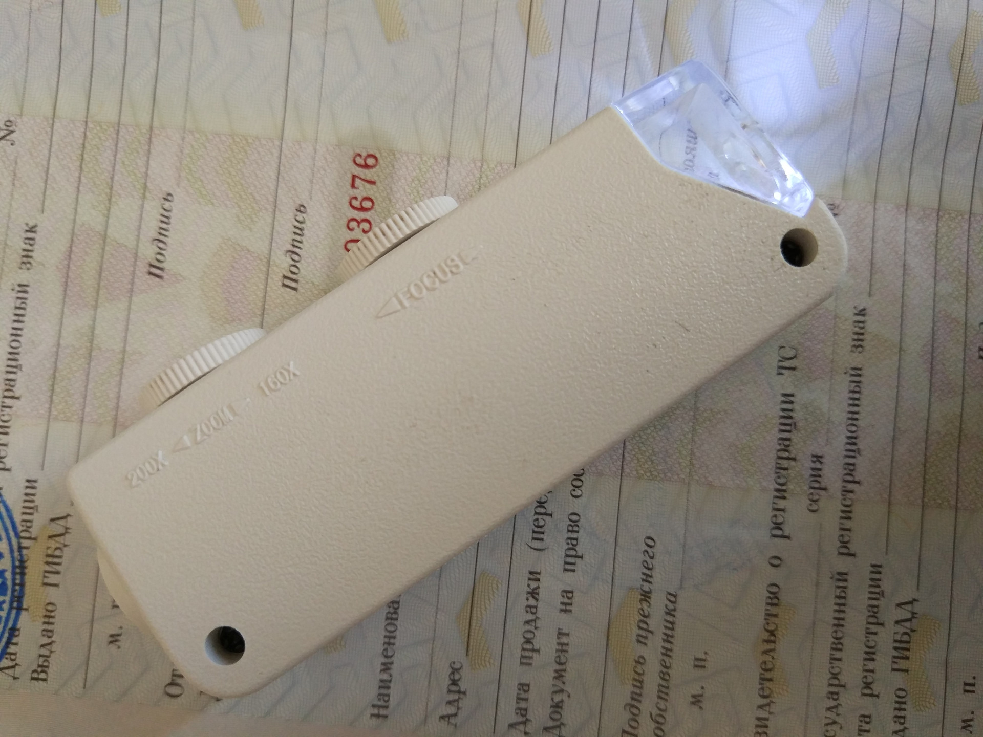 А на шрифте серии и номера ПТС, который выполнен в красном цвете, не должно быть никаких вкраплений посторонних цветов. Серия и номер ПТС — это штамп (высокая печать). Если присмотреться, то можно заметить, что символы серии и номера вдавлены в бланк. Стоимость китайского карманного микроскопа около $5-10. Требуется микроскоп не менее 60-кратного увеличения.