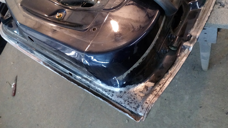 Там есть пару фоток и про похожее состояние двери. Зачистил щёткой на болгарке, грунт эпоксидный или кислотный, потом акриловый, на него герметик, который опять укрыл грунтом и покрасил. Внутрь двери распылил ruststop, чтобы всё проникло под отбортовку.