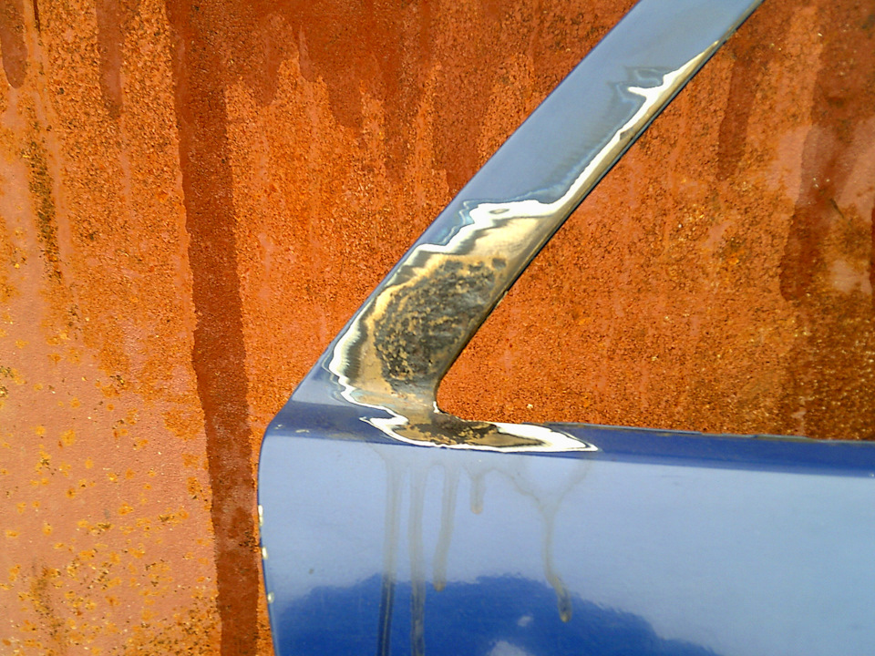 От этой ржавчины уже не избавиться, т.к. ржавчина лезет из под завальцованного шва двери над которым слой кузовного герметика. Если металл хорошо снаружи зачистить и обработать цинкарем, потом слой кислотного грунта, несколько слоев акрилового грунта и соответственно краска и лак, то может на год и хватит, но потом всё равно полезу жуки, т.к. повторюсь, что лезет рыжая чума из нутри из шва.