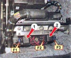 Потребуется вынуть предохранитель F3 и проверить его целостность (не глазами, а мультиметром, т.к. "на глаз" он может не отличаться от исправного). Если горелый, то не меняем его сразу на новый, т.к. новый тут же сгорит при включении зажигания, а ищем что же его угробило.