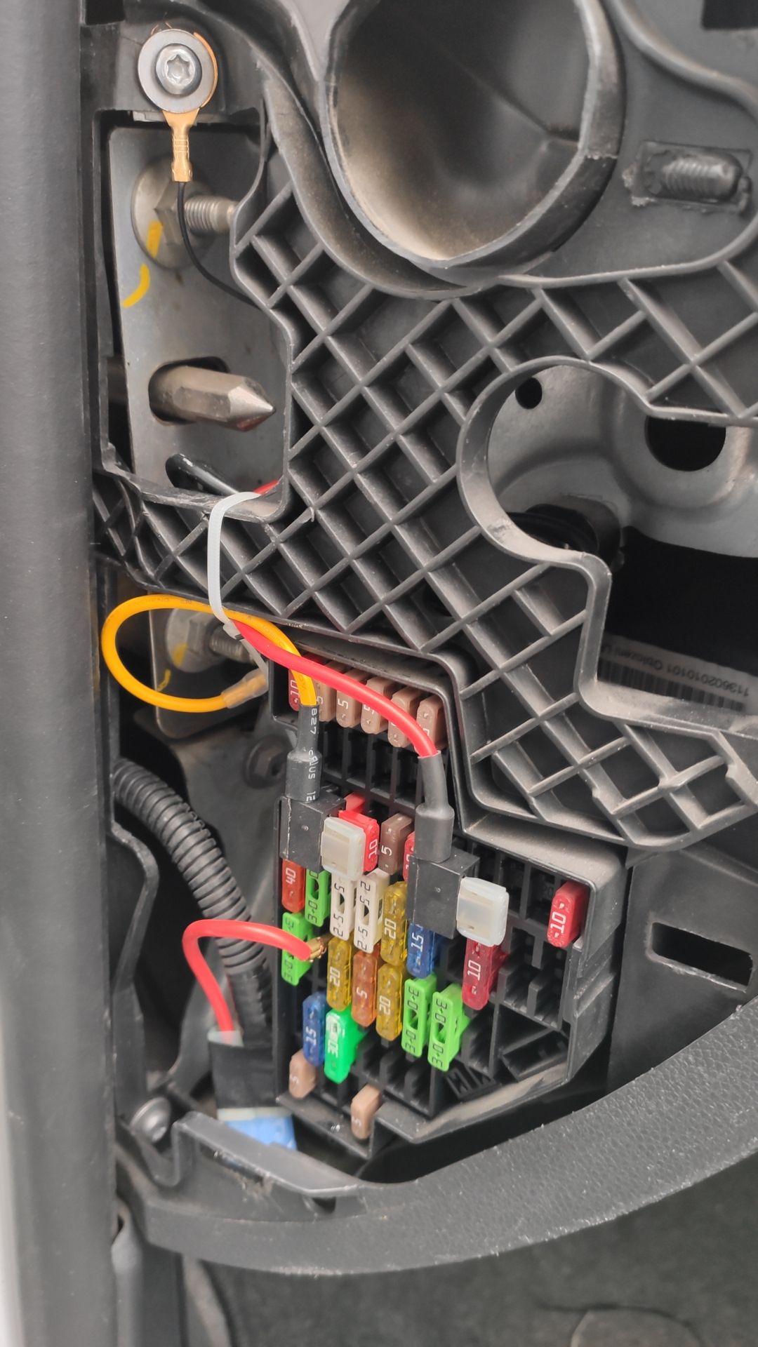 Короче подключил так: Жёлтый — постоянный плюс (подключился к 12 поеду — блок управления центральным замком) Красный — АСС в свободном слоте (нижний красный — до меня подключали радар-детектор) Минус на болт повесил наверху