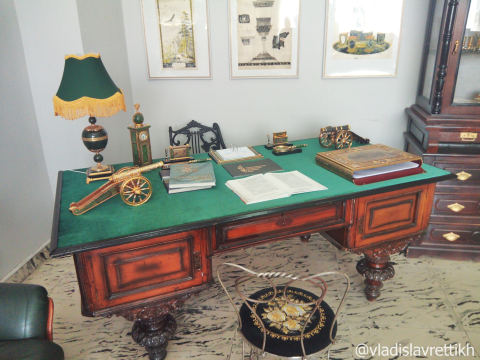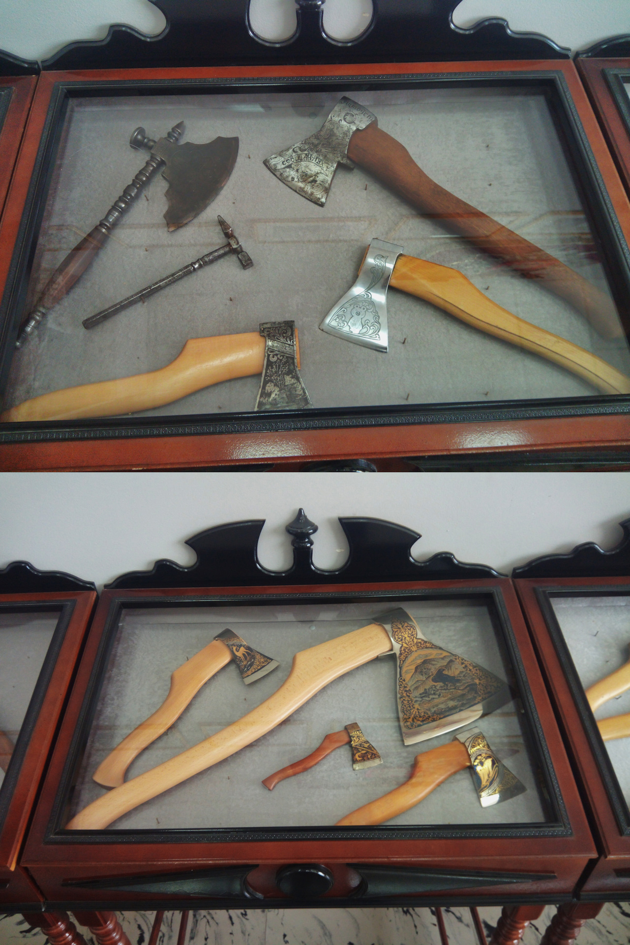 Пулемётчики-чапаевцы. Слева – Владислав, справа – Сергей.На правой фотографии Владислав держит в руках золочёный 7,62-мм пистолет-пулемёт, образца 1942/1943 г., системы Судаева (ППС). Нередко ППС называют лучшим пистолетом-пулемётом Второй мировой войны. Всего было выпущено 2 000 000 шт. (в СССР за время ВОВ – 500 000 шт.)Изготовленные топоры за всю историю завода. Экземпляр на нижней фотографии впечатляет своими размерами.Деловой стол с находящимся на нём атрибутами с Златоустовской гравюрой.Натюрморт рабочего места. Левый верх – пушка настольная с офисным ножом, 2013 г. Использованные материалы: латунь, нержавеющая сталь 40Х13, орех. Количество золота на изделии – 0,73 г. Использованные технологии: рисовка, гравирование, травление, никелирование, золочение, подрезка. Правый низ – кабинетный нож (нож для разрезания бумаги).Складной нож, поражающий своей утончённость. Ну конечно же и самурайская катана.