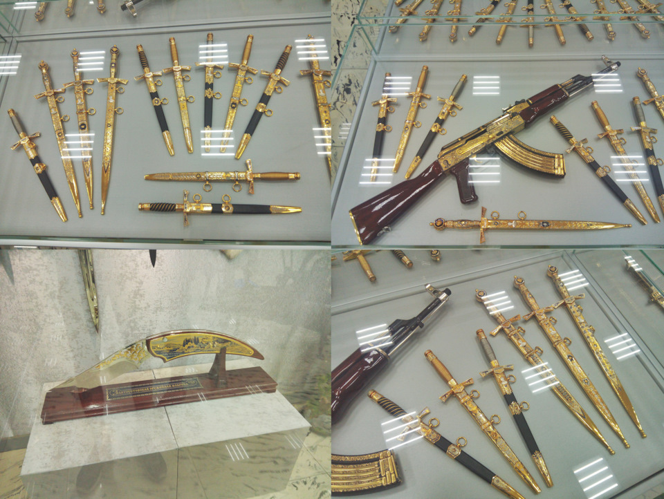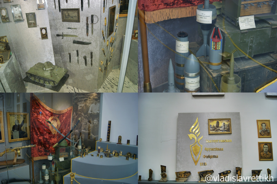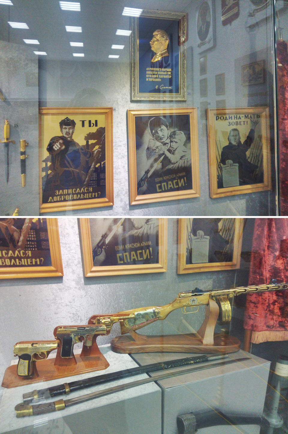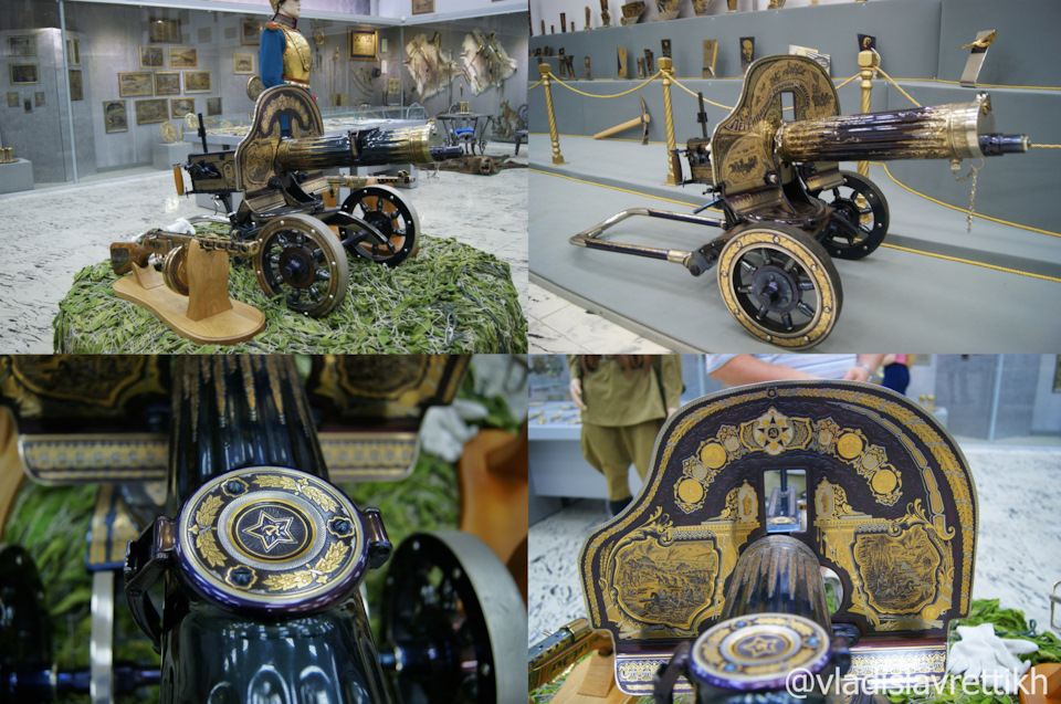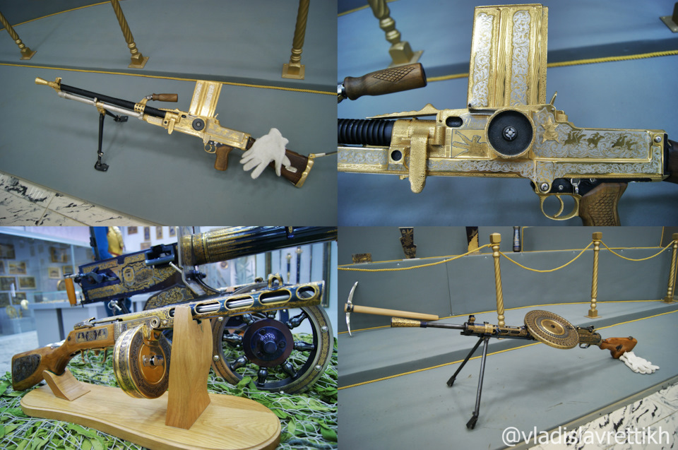 На нижнем фото представлены: «Золотой» пистолет Макарова. Использованные материалы: никель – 5 мкм., золото – 7 мкм. Техника исполнения: многоступенчатый цикл нанесения художественной гравюры на стали, рисовка кистью, травление, золочение, чернение, никелирование, гравировка резцом, подрезка, чеканка, ювелирные работы. Цена: 50 тыс. руб.; «Золотой» Револьвер-Наган. Использованные материалы: никель – 5 мкм., золото – 7 мкм. Цена: 85 тыс. руб.; Золочёный ППШ с портретом И. В. Сталина. Стоит отметить, что ещё в 1927 г., в ознаменование 10-летия Октябрьской революции в Златоусте было налажено производство наградных топоров, украшенных художественной гравировкой на трудовую и боевую тематику, а также портретами Ленина и Сталина.Две верхние фотографии: Чехословацкий золочёный ручной пулемёт времён Второй мировой войны – ММГ ZB-30 (Mg-30), 1930 г., состоявший на вооружении 24 стран мира. Левый низ – «золотой» ППШ. Использованные материалы: никель – 5 мкм., золото – 5 мкм. Цена: 460 тыс. руб. Правый низ – золочёный ручной пулемёт ДП-27, 1928 г. Один из первых образцов стрелкового оружия, созданных в СССР. Максимальная дальность: до 2500 м., вид боепитания: плоский дисковый магазин на 47 патронов. Всего было выпущено 795 000 шт.Украшенный пулемёт системы Максима, образца 1910/30 г., специально украшенный к 70-летию победы в Великой Отечественной войне. Разработанный британским оружейником Хайремом Стивенсом Максимом в 1883 г, русский вариант «Максим» прошёл модернизацию на Тульском оружейном заводе в начале XX в. Был изготовлен в 1944 г. на Ижевском механическом заводе, о чем свидетельствуют соответствующие клейма на поверхности пулемёта. Автором украшения пулемёта стал С.Ф. Чернов – один из ведущих гравёров фабрики, Член Союза художников России и лауреат Государственной премии РФ в области искусства. В соответствии с темой пулемёт украсили изображения скульптур «Родина-мать зовёт» и «Воин-освободитель», батальные сцены с применением пулемёта, медали за оборону городов-Героев и традиционные узоры. Все детали пулемёта вплоть до колёс покрыты Златоустовской гравюрой, которая на поверхности металла помимо красоты выполняет защитные функции против коррозии. Вес пулемёта – 65 кг. Как видно из фото, в музее имеется целых два пулемёта системы Максим.