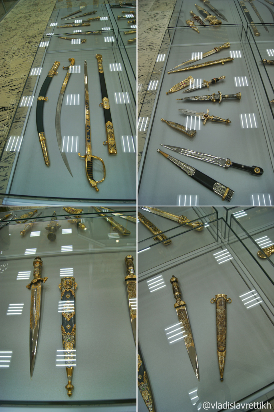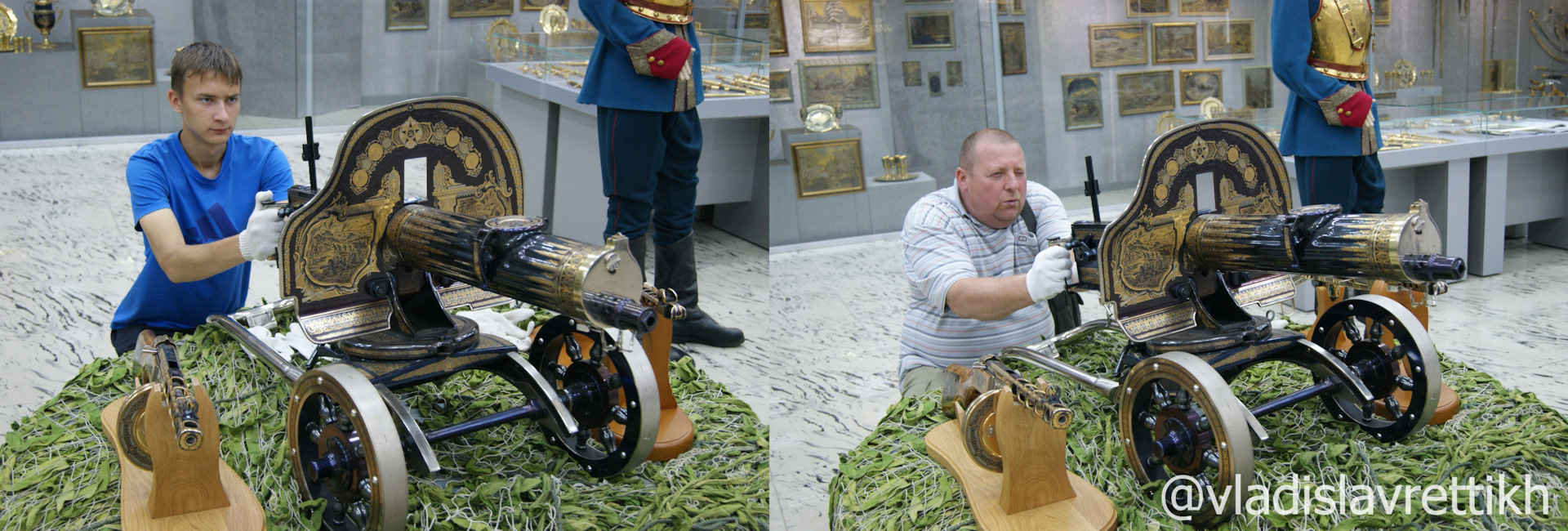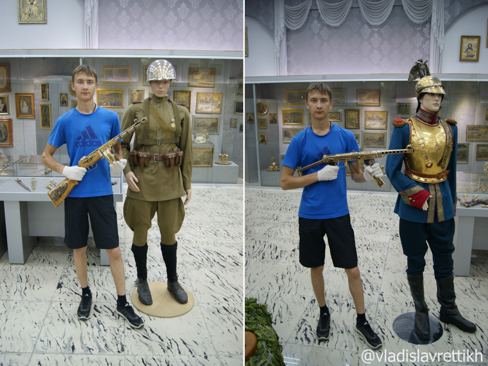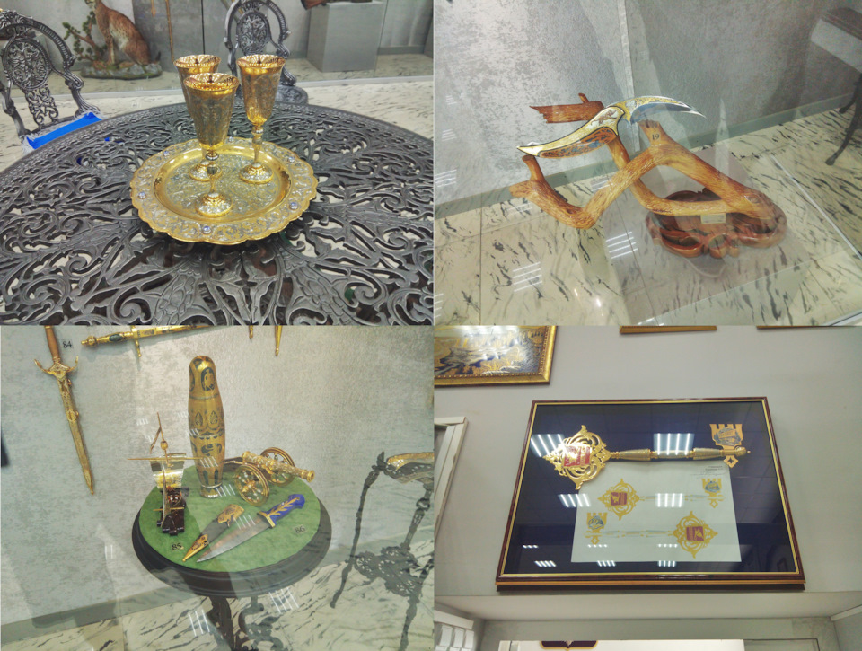 На нижнем фото представлены: «Золотой» пистолет Макарова. Использованные материалы: никель – 5 мкм., золото – 7 мкм. Техника исполнения: многоступенчатый цикл нанесения художественной гравюры на стали, рисовка кистью, травление, золочение, чернение, никелирование, гравировка резцом, подрезка, чеканка, ювелирные работы. Цена: 50 тыс. руб.; «Золотой» Револьвер-Наган. Использованные материалы: никель – 5 мкм., золото – 7 мкм. Цена: 85 тыс. руб.; Золочёный ППШ с портретом И. В. Сталина. Стоит отметить, что ещё в 1927 г., в ознаменование 10-летия Октябрьской революции в Златоусте было налажено производство наградных топоров, украшенных художественной гравировкой на трудовую и боевую тематику, а также портретами Ленина и Сталина.Две верхние фотографии: Чехословацкий золочёный ручной пулемёт времён Второй мировой войны – ММГ ZB-30 (Mg-30), 1930 г., состоявший на вооружении 24 стран мира. Левый низ – «золотой» ППШ. Использованные материалы: никель – 5 мкм., золото – 5 мкм. Цена: 460 тыс. руб. Правый низ – золочёный ручной пулемёт ДП-27, 1928 г. Один из первых образцов стрелкового оружия, созданных в СССР. Максимальная дальность: до 2500 м., вид боепитания: плоский дисковый магазин на 47 патронов. Всего было выпущено 795 000 шт.Украшенный пулемёт системы Максима, образца 1910/30 г., специально украшенный к 70-летию победы в Великой Отечественной войне. Разработанный британским оружейником Хайремом Стивенсом Максимом в 1883 г, русский вариант «Максим» прошёл модернизацию на Тульском оружейном заводе в начале XX в. Был изготовлен в 1944 г. на Ижевском механическом заводе, о чем свидетельствуют соответствующие клейма на поверхности пулемёта. Автором украшения пулемёта стал С.Ф. Чернов – один из ведущих гравёров фабрики, Член Союза художников России и лауреат Государственной премии РФ в области искусства. В соответствии с темой пулемёт украсили изображения скульптур «Родина-мать зовёт» и «Воин-освободитель», батальные сцены с применением пулемёта, медали за оборону городов-Героев и традиционные узоры. Все детали пулемёта вплоть до колёс покрыты Златоустовской гравюрой, которая на поверхности металла помимо красоты выполняет защитные функции против коррозии. Вес пулемёта – 65 кг. Как видно из фото, в музее имеется целых два пулемёта системы Максим.