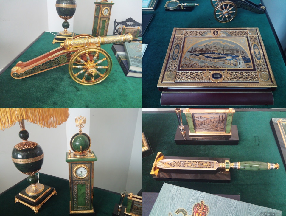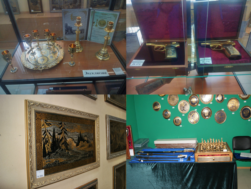 Немного магазинной продукции. Цены, конечно, впечатляют: левый верх – набор винный «Царский гранат» (эксклюзив), в единственном экземпляре. Использованные материалы: латунь, кабошоны (гранат) диаметром 105 мм, фианиты. Набор состоит из блюда латунного инкрустированного камнями диаметром 350 мм, шести фужеров 170 мм и двух подсвечников высотой 285 мм. Общее количество драгоценных металлов на изделии: золота – 2,689 гр., серебра – 2,02 гр. Ювелирные вставки – 1 696 шт. Общий вес изделия – 6 кг. Цена – 650 тыс. руб. Правый верх – подарочные ПМ-ы за 26 тыс. руб. каждый. Левый низ – панно «Горная речка», 305*185 мм. Технологии, применяемые при изготовлении: гравирование, травление, никелирование, золочение, синение. Цена – 14 тыс. руб. Правый низ – шахматы ручной работы (гравирование, травление, никелирование, золочение, синение, подрезка по металлу), с использованием таких материалов, как: латунь, сталь, камень морион, горный хрусталь, искусственный камни – фианиты, дерево ценных пород – орех, дуб, красное дерево. Ручки на футляре инкрустированы горным хрусталем Ф17мм и морионом Ф17мм. Футляр украшен панно с изображением римских гоплитов и греческим орнаментом. Фигуры инкрустированы горным хрусталем Ф14мм и морионом Ф14мм, в количестве 10 шт. Цена – 177 тыс. руб.