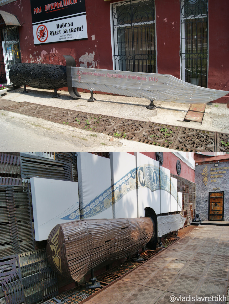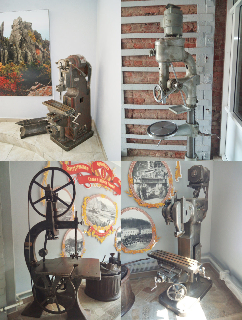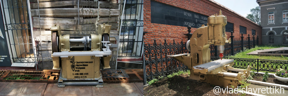 Перед входом в магазин и музей расположены огромные макеты Златоустовских ножей.Немаленький Златоустовский складишок.Перед входом в музей расположены: слева – точильный станок, справа – фрезерный станок.