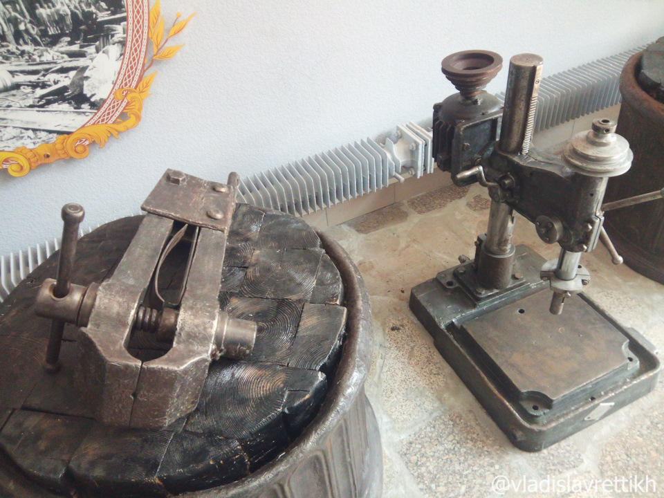 Левый верх – вертикально долбежный станок; правый верх – сверлильный станок; левый низ – ленточная пила.Слева – тиски, справа – сверлильный станок.