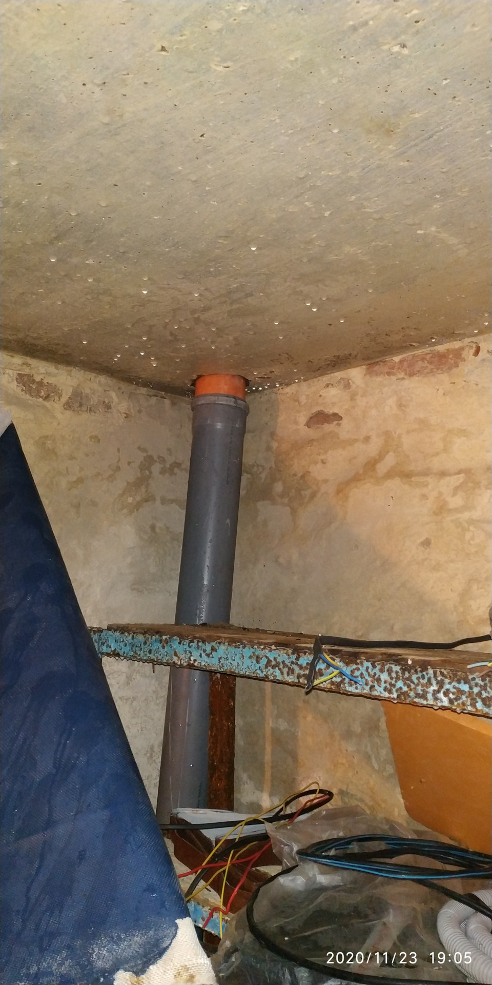 Приточка с улицы 110 труба, вытяжка выше гаража 110 труба (капает с неё прилично, ведро подставил), стены кирпич, на полу стяжка с шариками пенопласта на плёнке, потолок плиты. Влага есть но на потолке капель за лето не было а вот на пенопласте который на стелаже лежит снизу вся площадь в каплях.