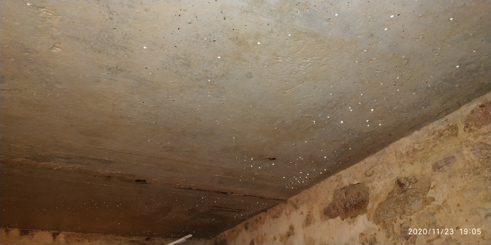 Пол в подвале слоями:глина-щебень и верхний слой песок. Все время было сухо. Коментарии драйвовцев натолкнули на мысль — конденсат на перекрытии из-за теплого подвала и хорошо проветриваемого гаража. Пол гаража охлаждается и охлаждает плиту перекрытия-подвал теплый, поэтому конденсат на потолке