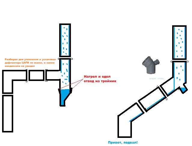Слабый приток холодного воздуха, по этому он не успевает выдавливать тёплый воздух от туда и конденсат, изначально нужно проверить тягу в обеих трубах (может что то попало) на притоке освободите угол что бы был свободный доступ, в целом схема правильная и должна работать если слабая тяга нужно будет увеличить приточные трубы