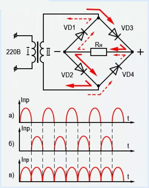 В используемой же нами РЭ аппаратуре везде требуется так или иначе другое напряжение питания и очень часто постоянный, а не переменный ток. Поэтому первое, с чем встречается электрический ток питания, попадая в любой усилитель/проигрыватель/фонкорректор/телевизор и т.д. — БЛОК ПИТАНИЯ. Бывают они двух типов: классический трансформаторный и современный импульсный. В классическом блоке питания сетевое напряжение проходит через первичную обмотку трансформатора и на вторичной обмотке (чаще обмотках) появляется уже нужное нам напряжение питания для последующей схемы прибора. Однако, это напряжение теперь нужно сделать ещё и постоянным, Для этого используется хитрая схема включения 4х диодов под названием "диодный мост". Смысл этой схемы в том, что положительные полуволны относительно нуля она пропускает прямо, а отрицательные переворачивает и тоже пропускает прямо. В Интернете полно подробного разъяснения работы моста разной степени глубины и даже анимации и получасовые видосы есть. Но мне понравилась эта картинка.