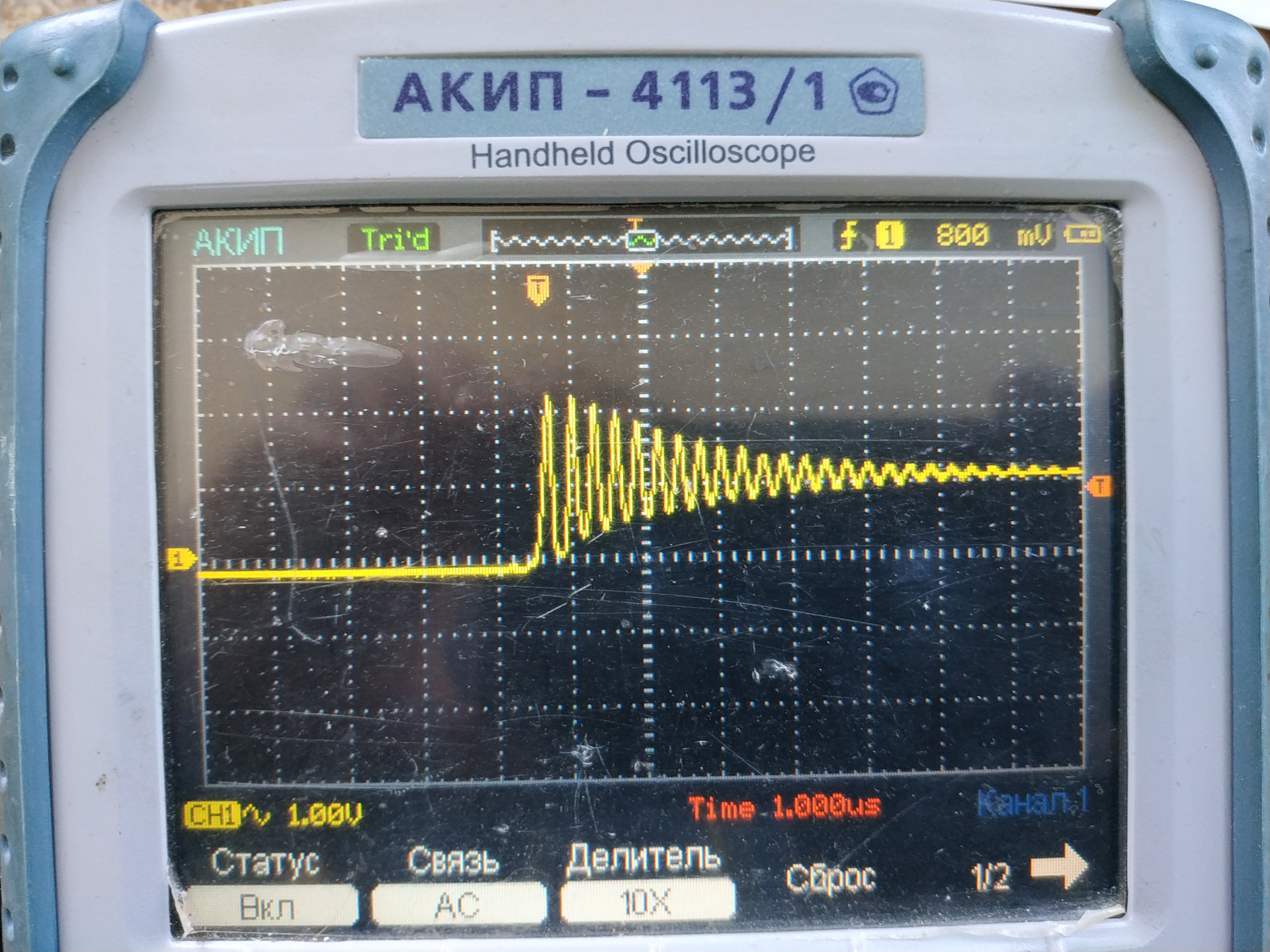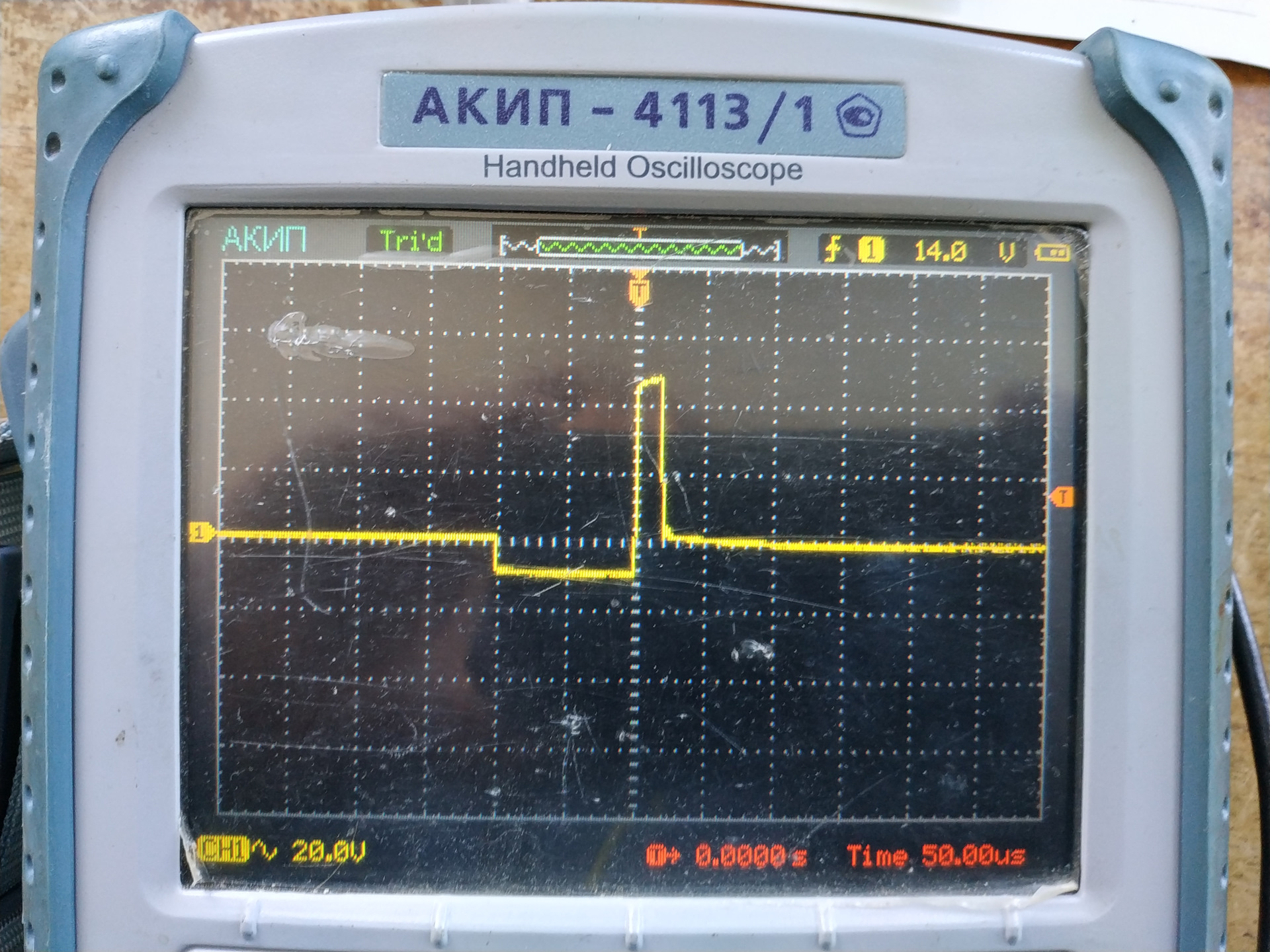На холостом ходу на выходе девайса импульсы амплитудой около 60вольт.