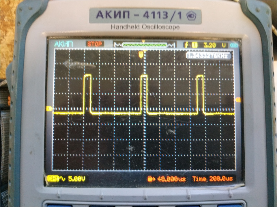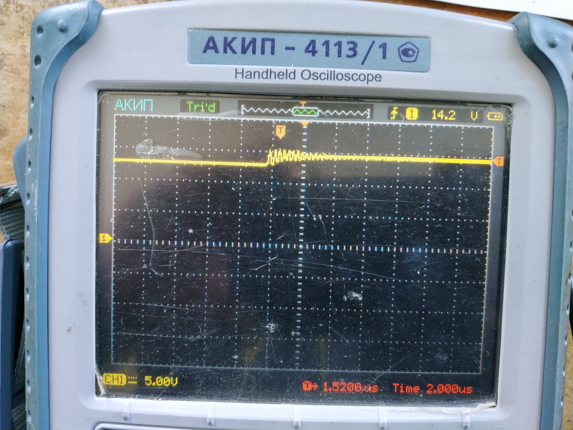 Сперва меня смутило что импульсы так сильно проседают. Но, подключив последовательно с АКБ резистор на 0,15Ом и посмотрев осциллограмму на нем (не сфоткал) там размах импульсов около 1,5В, что означает около 10А в пике. Ну, наверное так и должно быть)))