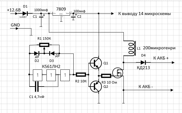 Далее к этому генератору примуслявил стабилизатор на 7809 и типа драйвер на биполярных транзисторах. Его можно было и не делать, а использовать три оставшихся инвертора в микросхеме (настроив скважность генератора на 10%) тогда схема еще упростится, но мне захотелось именно так.