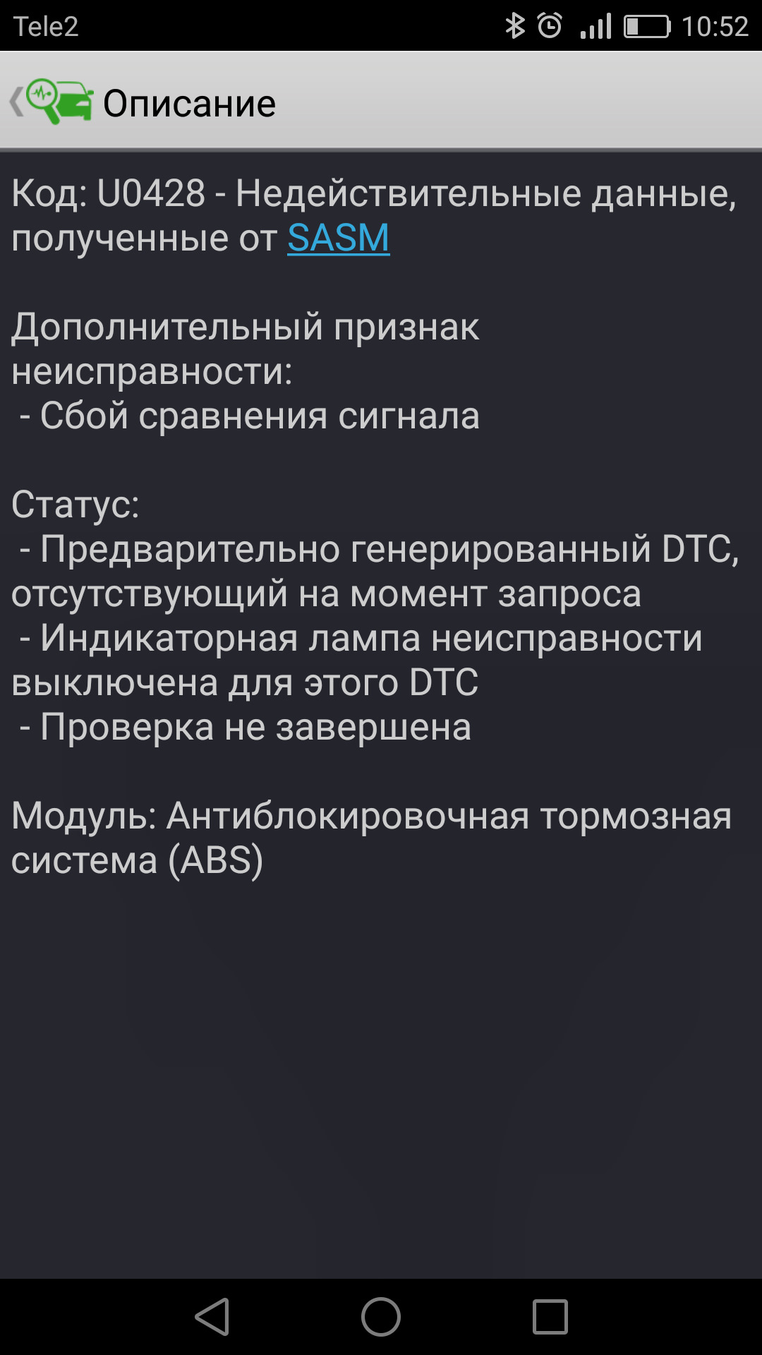 Ехал по неровной дороге, загорелся значок скользкая дорога, остановился он не гаснет, выключел зажигание, включил снова, он все горит. Повернул руль влево в право он погас. Проверил ошибки, ошибка U0428, не удаляется. Мазда 3 BL.