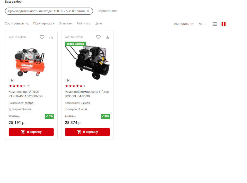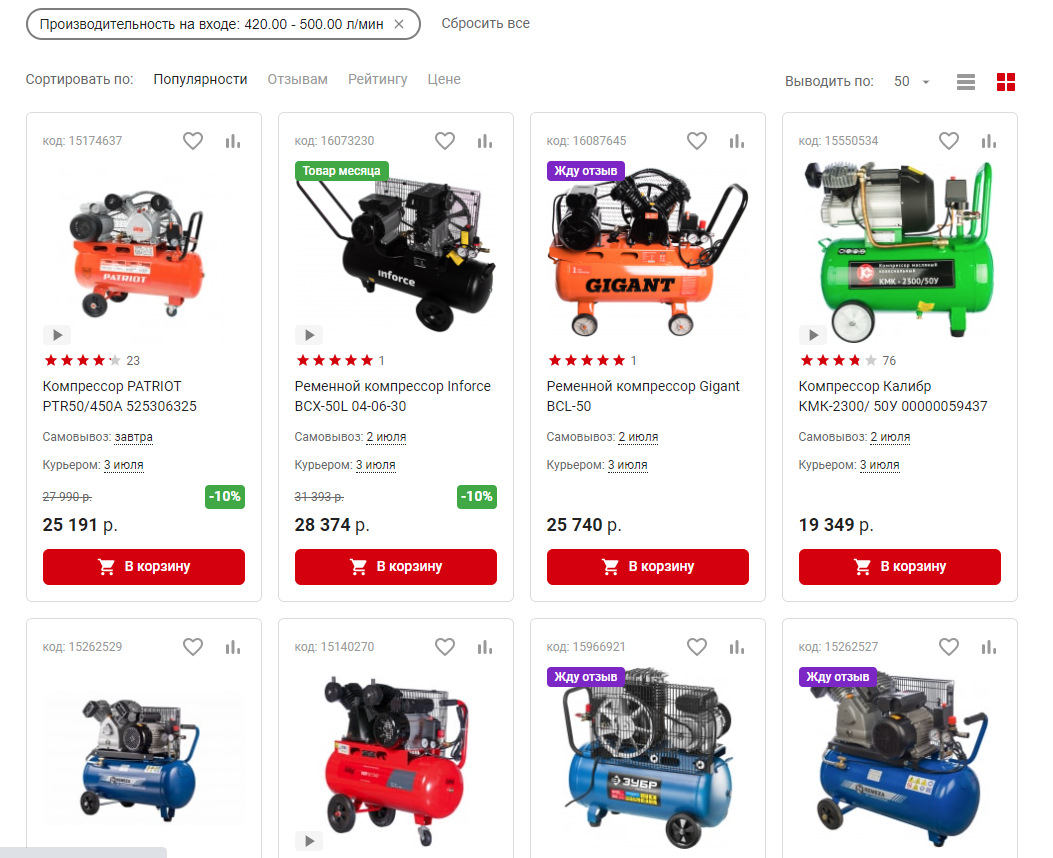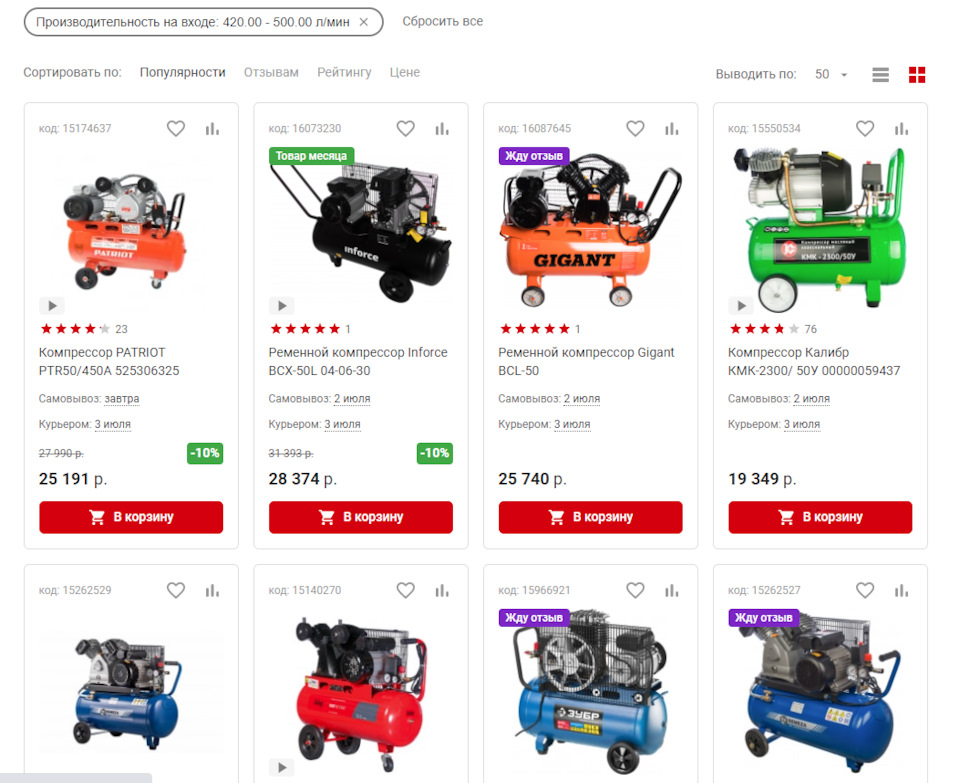 Ну вот специально отсортировал по ресиверу 50 литров, напряжению 220 Вольт и расходу воздуха 420-500 литров в минуту. Получилось 8 штук, из них только 1 с прямым приводом и 7 с ременным.