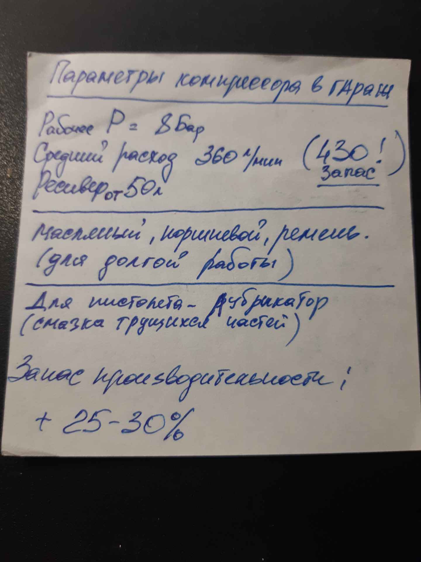 Если обслуживать личный авто гайковерт ом, производительность больше 300 л/м. Если подкрашивать и мовилить личный авто обьем ресивера от 50л. Это с натягом и перекурами
