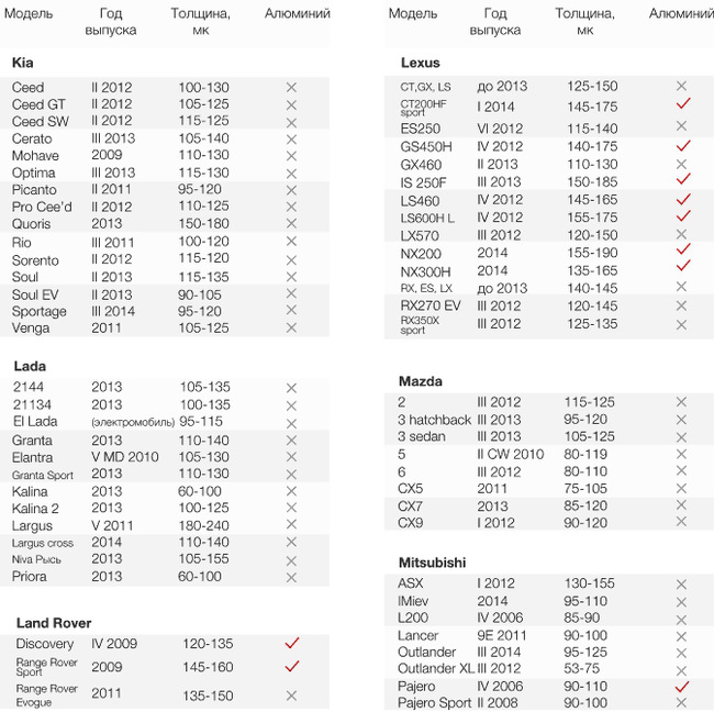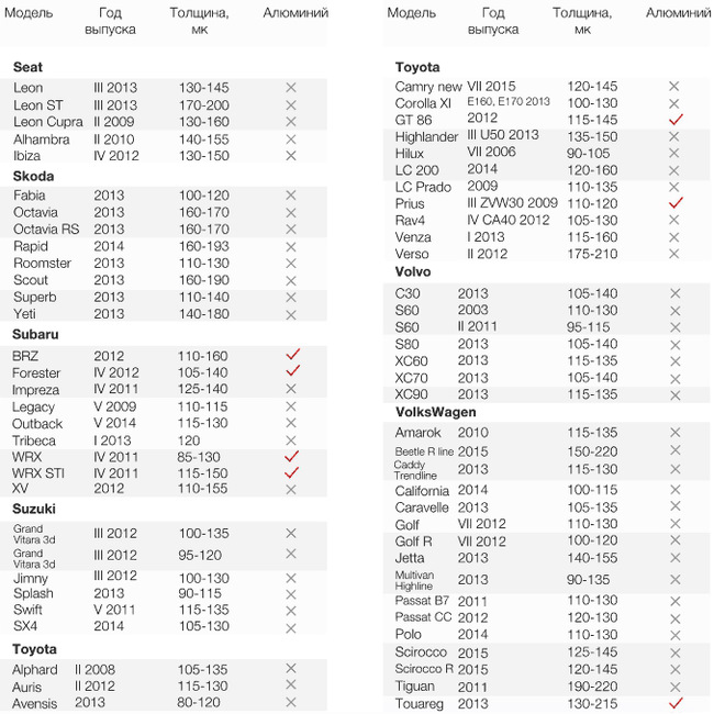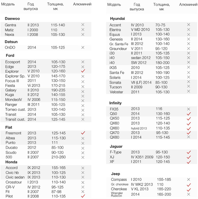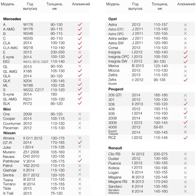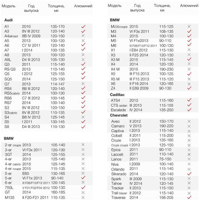 Ниже таблица толщины ЛКП для разных моделей авто и наличие алюминия, среди деталей кузова. Сразу скажу, данные всех подобных таблиц не идеальны и не абсолютно точны. Но как ориентир — использовать можно.