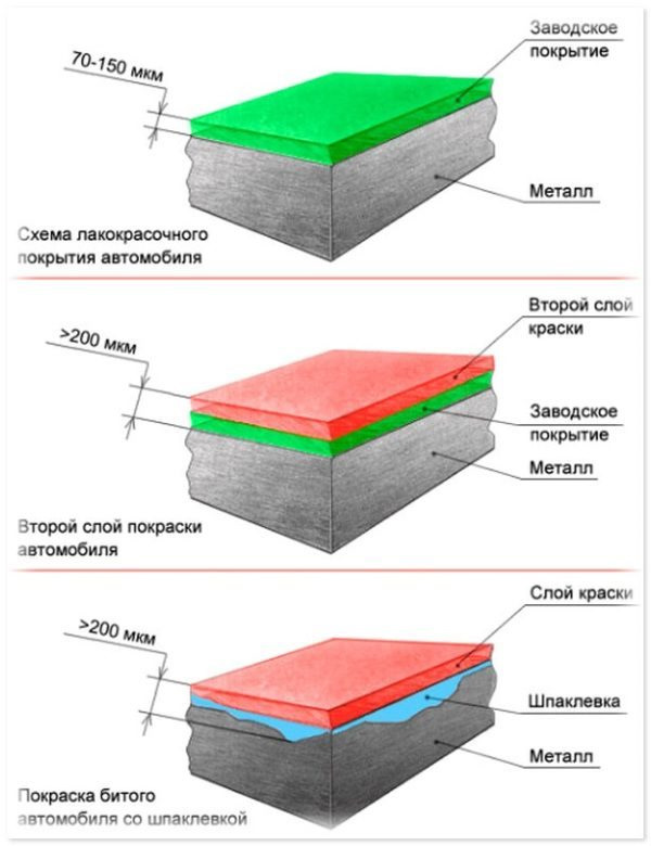 Внутренние части кузова, проёмы дверей, подкапотное пространство, салон и багажник окрашиваются более тонким слоем, так как они не подвержены постоянному разрушительному воздействию окружающей среды. Например, если на кузове показания толщиномера 100, в проемах вполне может быть 50 мкм.