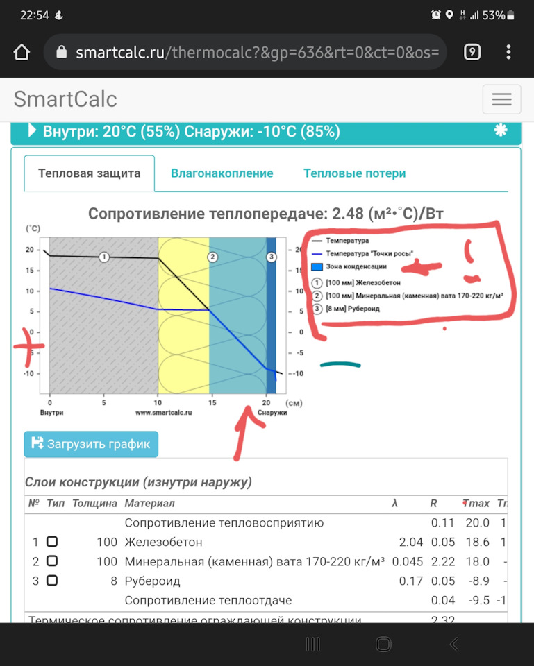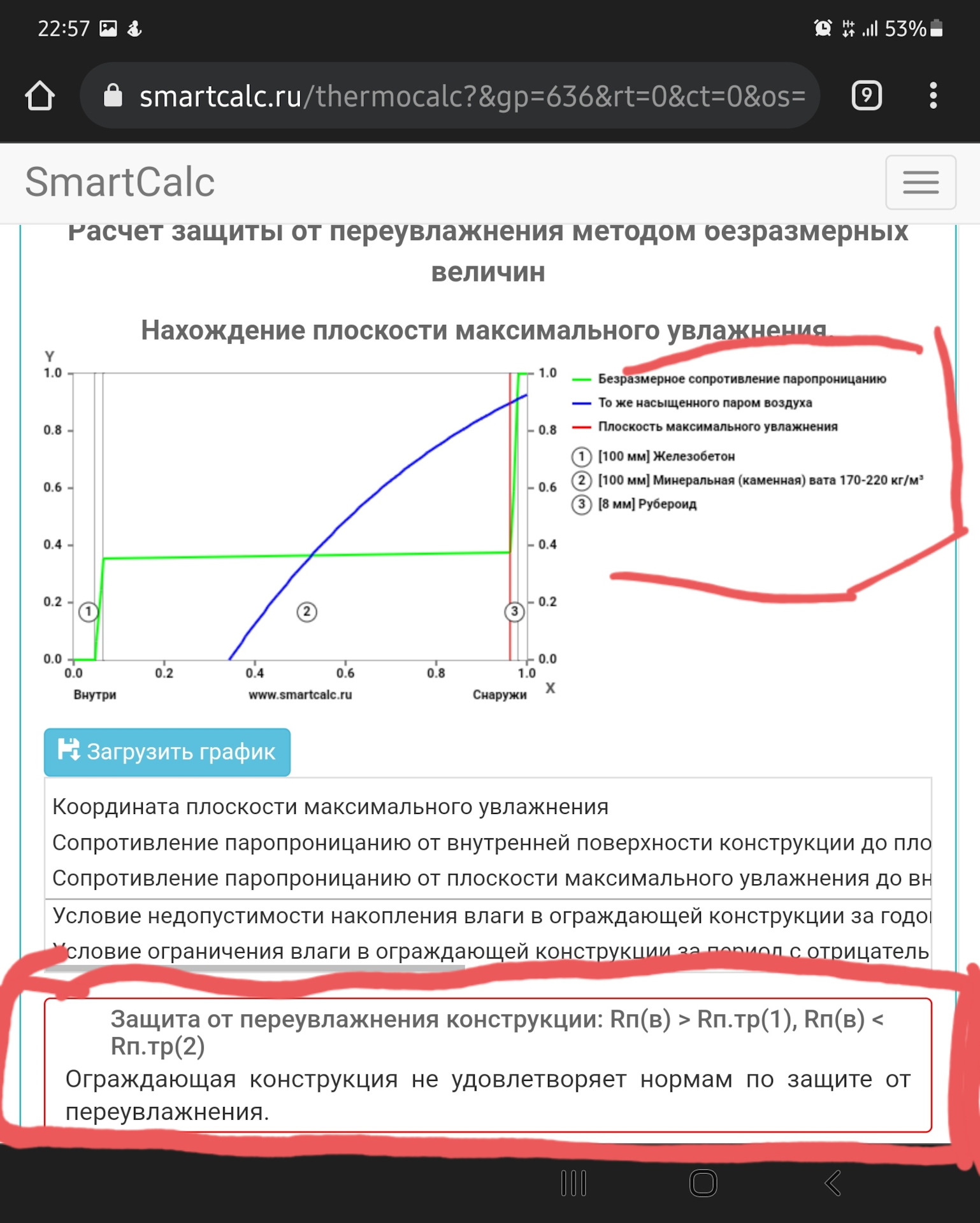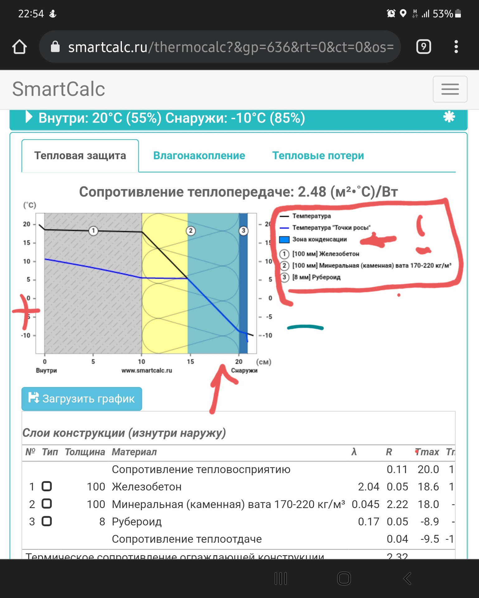 Любая минвата в любом месте паропроницаема, соответственно если пар проникает, то он и накапливается в ней. Для осушивания делают вентзазор. Поэтому кришы с минваты с вентзазором. Вот скрин техрасчета вашего слоя. Бетон 100мм, минвата вашей плотности 100 мм и рубероид. На фото видно переувлажнение минваты и нарушение норм. Не верите? Пересмотрите нормы по крышам. Правильно было бы сделать рейки, ветрозащиту и кровельное покрытие…