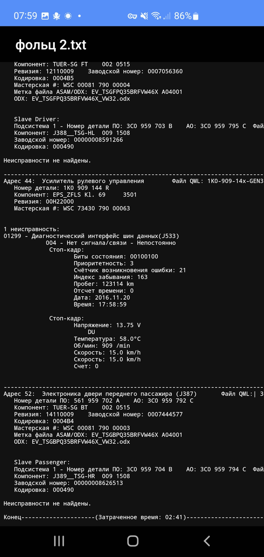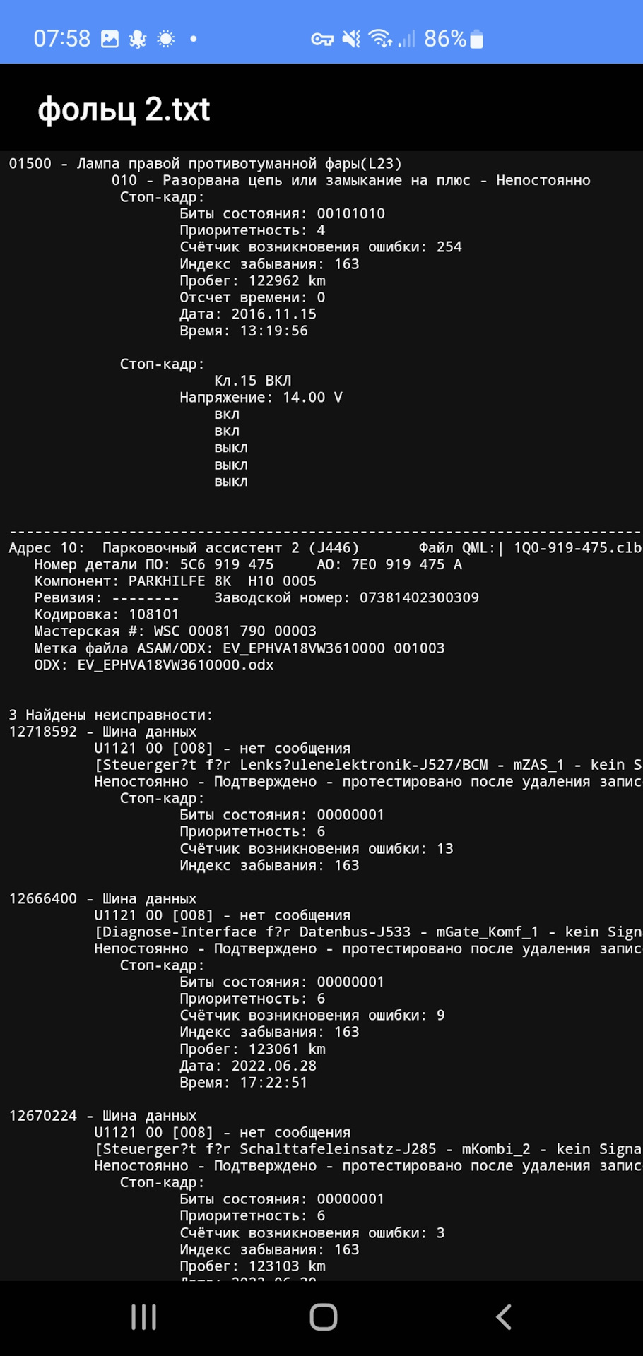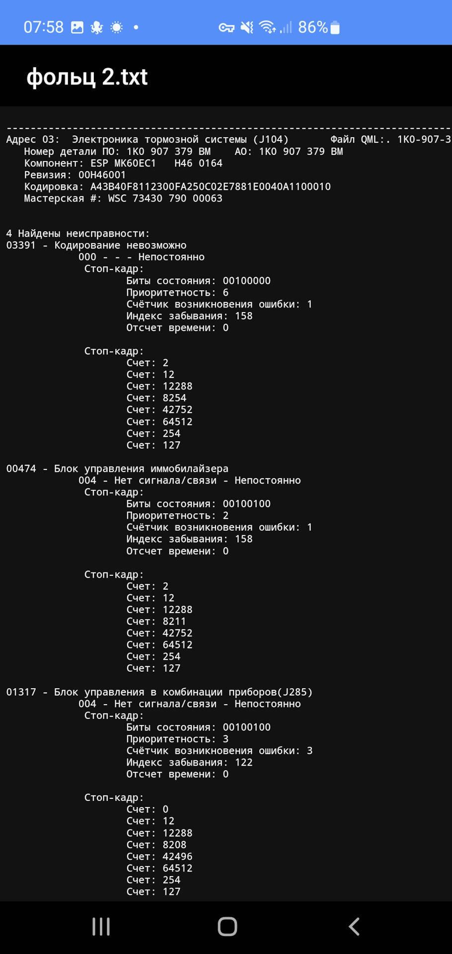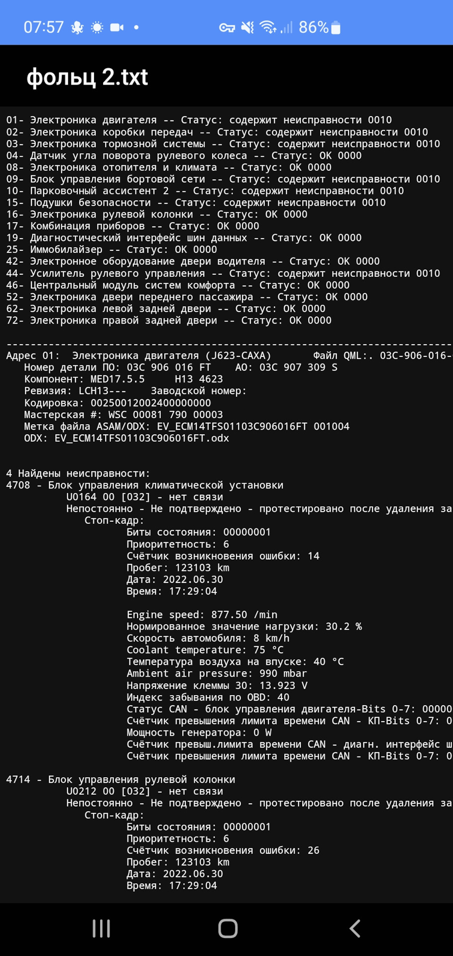 Подскажите пожалуйста, машина Jetta 6 1.4 122 caxa 2014 года. Все в общем классно. Но стала появляться надоедающая проблема. Переодически выскакивает ошибка esp. По субъективным ощущениям только когда довольно жарко на улице. И как показалось связано с поворотом руля. Шнурок Вася приобретен, ошибки после удаления всегда выскакивают одни и те же. В тех же блоках. Лог приложу к сообщению. Если кто то сталкивался с таким же буду рад подсказакам и советам. Так как ехать в сервис с плавающей проблемой попадающей при перезапуске пока думаю не имеет смысла. Заранее спасибо)