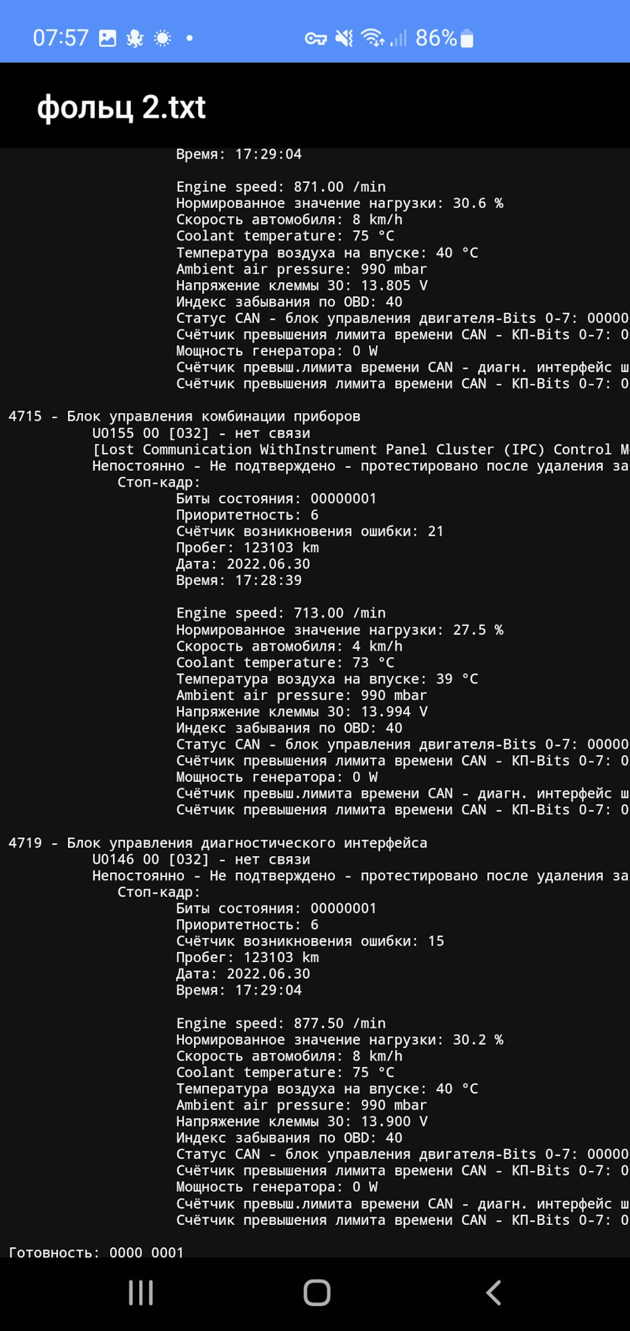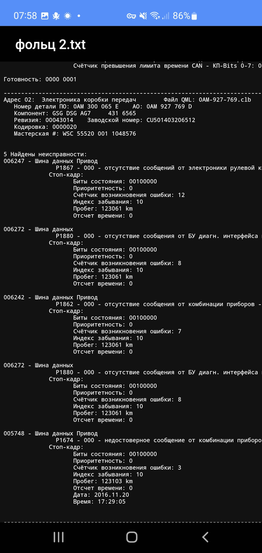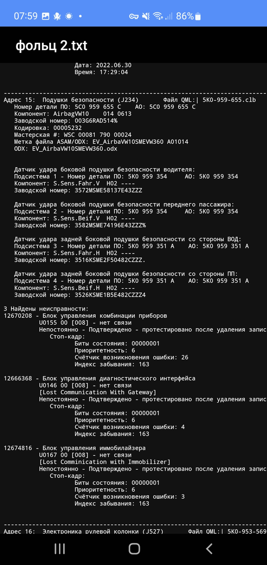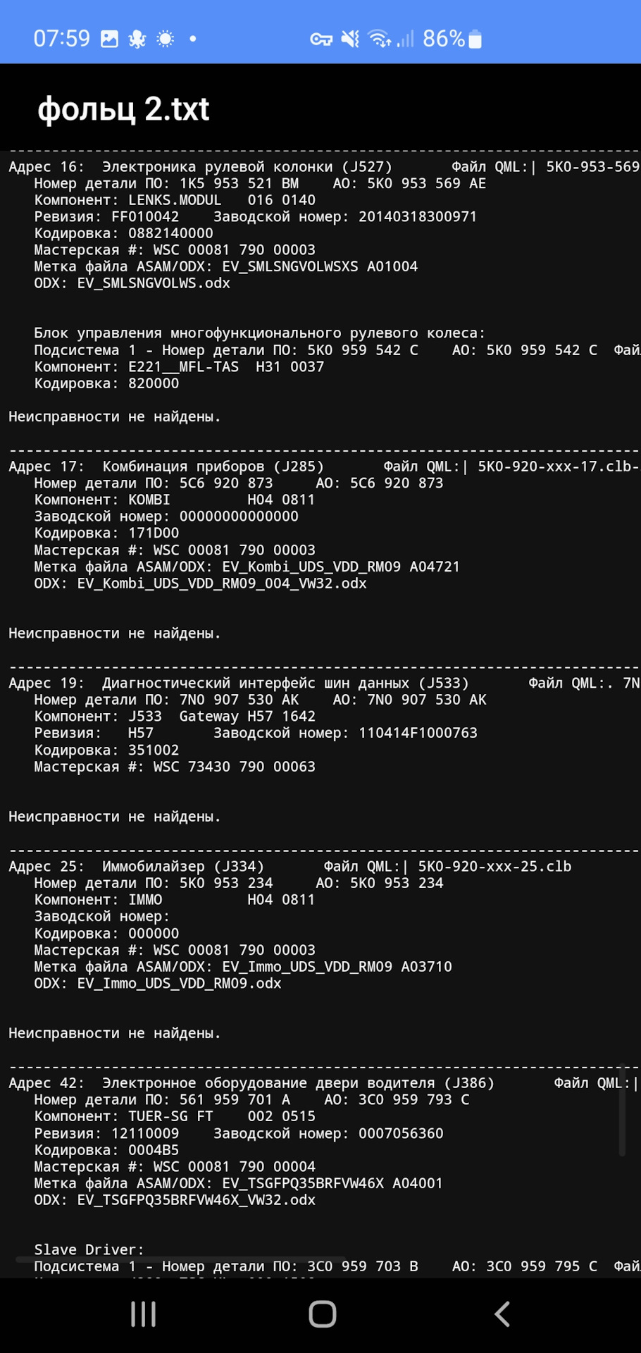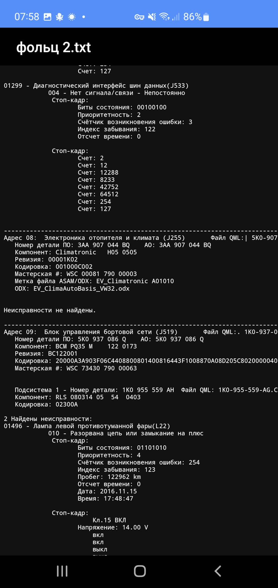 Подскажите пожалуйста, машина Jetta 6 1.4 122 caxa 2014 года. Все в общем классно. Но стала появляться надоедающая проблема. Переодически выскакивает ошибка esp. По субъективным ощущениям только когда довольно жарко на улице. И как показалось связано с поворотом руля. Шнурок Вася приобретен, ошибки после удаления всегда выскакивают одни и те же. В тех же блоках. Лог приложу к сообщению. Если кто то сталкивался с таким же буду рад подсказакам и советам. Так как ехать в сервис с плавающей проблемой попадающей при перезапуске пока думаю не имеет смысла. Заранее спасибо)