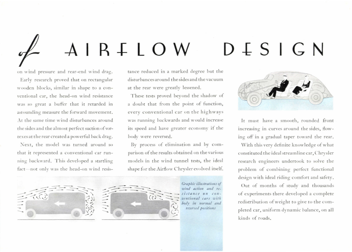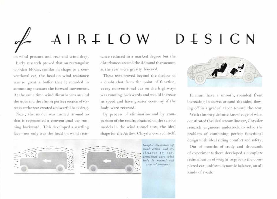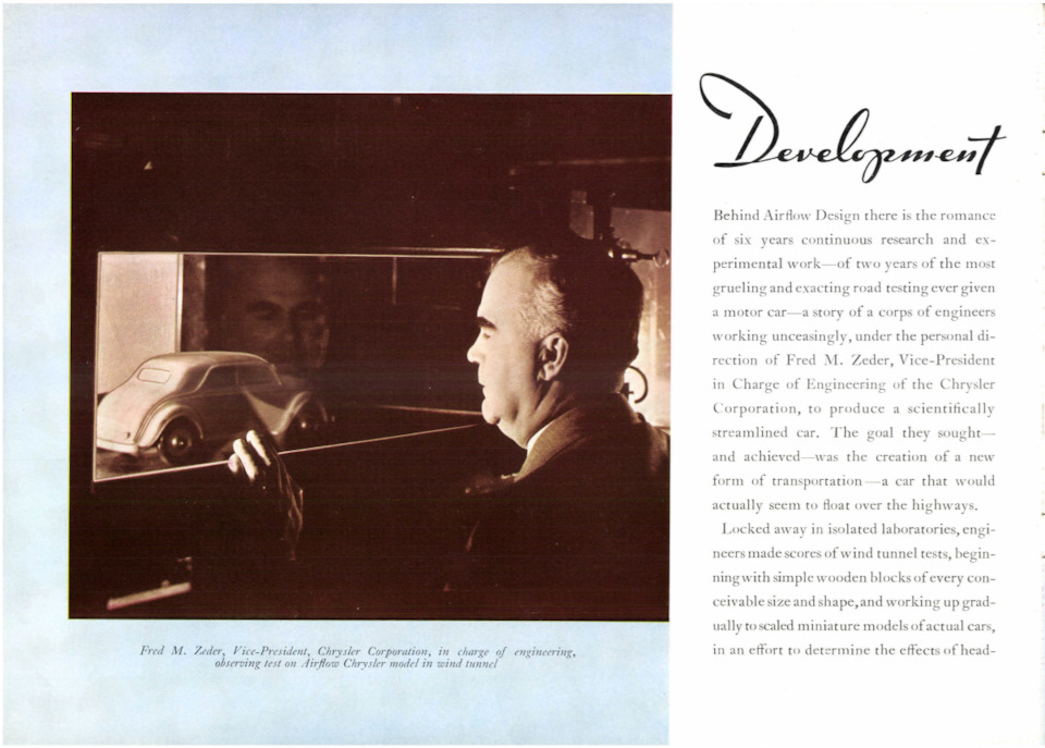 Работы курировал глава технического департамента Карл Брир. Именно Брир первым среди крайслеровских специалистов задумался об обтекаемости – говорят, наблюдая за полетом диких гусей. В Хайленд-Парке была построена аэродинамическая труба. Исследовав множество образцов макетов (не менее 50!) американских моделей 1930 года в аэродинамической трубе, Брир пришел к неожиданному выводу – все эти машины были более обтекаемы сзади, нежели спереди! Немудрено, учитывая высокие радиаторы, отдельные фары и колеса спереди и плавно скругленную заднюю часть. По итогам продувок макетов были сделаны выводы – хорошая аэродинамика поможет увеличить максимальную скорость и снизить расход топлива при неизменных двигателе и ходовой части.