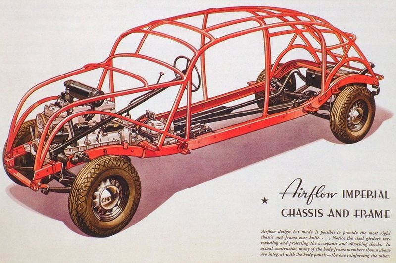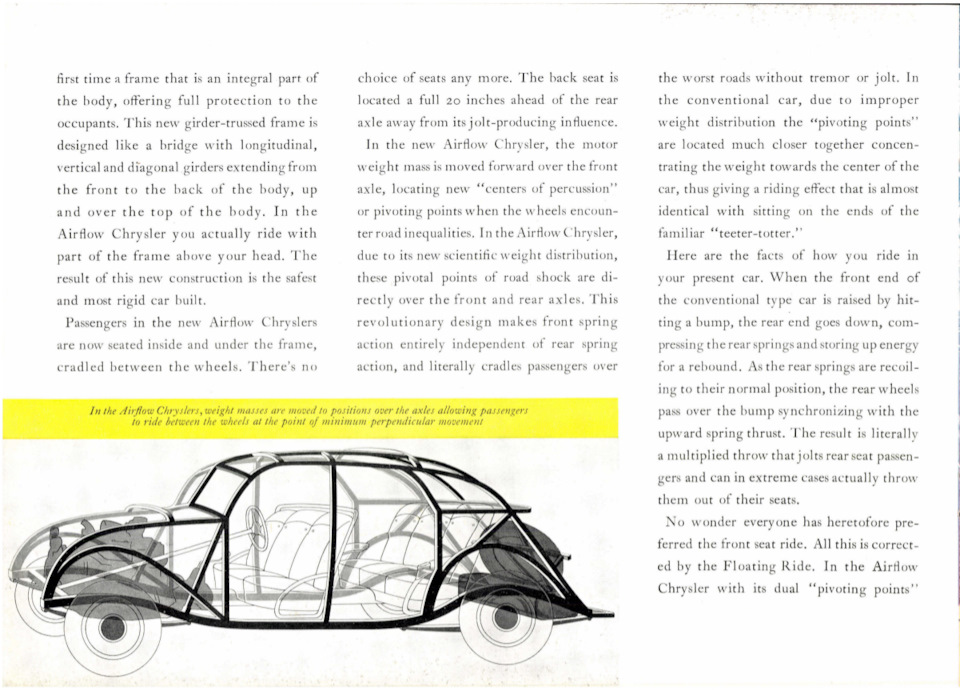 Техническая часть машины была более традиционной. Коробка передач была 3-ступенчатой механической, подвеска всех колес – зависимая на полуэллиптических рессорах (рессоры удлинили для улучшения плавности хода и комфорта), тормоза всех колес – барабанные. Автомобиль был полноразмерным и выпускался в 2- и 4-дверном кузовах с разными вариантами колесной базы. Самым компактным был DeSoto (база 2930 мм, длина 5280 мм), стандартными — Chrysler Airflow (база 3137 мм, 3250 мм для версии Imperial, 3492 мм для версии Custom Imperial), а еще выпускался лимузин с увеличенной до 3720 мм базой. Диапазон цен был весьма широк – от 1625 долларов за скромный DeSoto до 5145 долларов за лимузин Airflow.