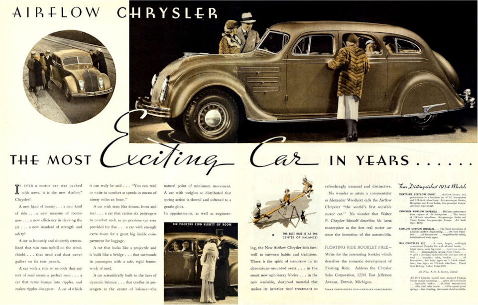 Чтобы оценить, насколько внешность была непривычной, я предлагаю вам сравнить Chrysler Airflow с типичными седанами 1934 года других американских фирм – Ford, Chevrolet, Studebaker, Nash. Согласитесь, машина выглядела революционно для своего времени и немудрено, что публика была шокирована внешним обликом.
