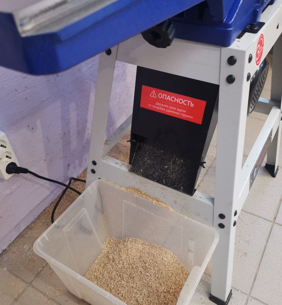 Стружкоосос я еще не купил, поэтому просто подставил пластиковый ящик, забавно, но он отлично справился с задачей. Видно конечно что часть стружки лежит за ним, но она вылетает со стороны паралельного упора, с задней стороны станка.