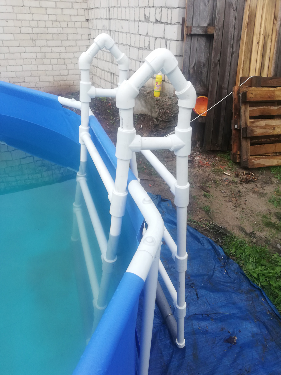 Прошло наверное много времени и мой "Гаражик для ремонта авто и отдыха" немножко изменился. Планы еще большие, и потихоньку они выполняются. Из-за жаркого лета как то случайно купили бассейн, пришлось увеличить территорию. Спаял из полипропиленовой 32 трубы белого цвета стремяночку для посещения бассейна, внутрь идеально вошла толстостенная металлическая трубка на 20 мм. Думаю перед морозами, когда спустим водичку забетонировать площадку под уровень, и выложить плиткой дорожку к бассейну, по пути площадку возле мангала.