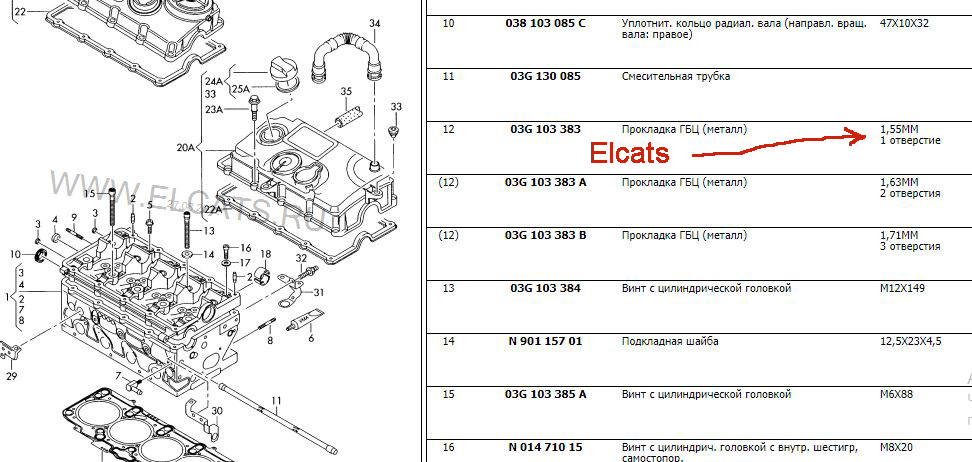 А в чем противоречия?! По Эльзе написано с выступом от 1.01 до 1.1 мм ставить с двумя отверстиями, в элькатс указаны 3 прокладки на выбор — с одним отверстием имеет толщину 1.55, с двумя — толщину 1.63, с тремя — 1.71! Где в элькатс написано что вам нужна с одним отверстием?