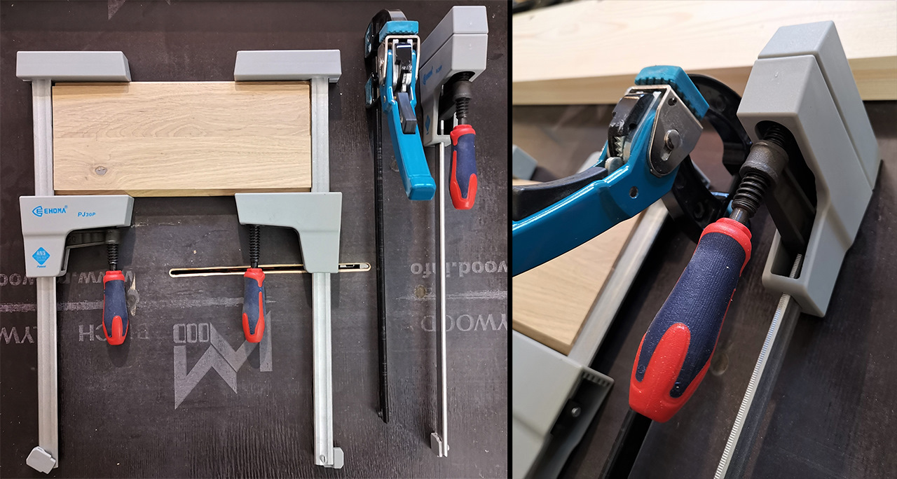 Изначально думал купить еще пару GROSS 20721, которыми я весьма доволен, быстрый зажим и просто дикая мощность (сосна легко лопается от сжатия). инус гросса их цена в 2500 рублей против 1000 рублей за EHOMA, ну и было очень интересно попробовать именно корпусные струбцины.