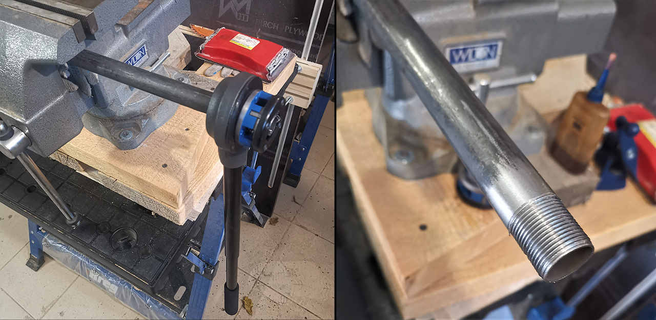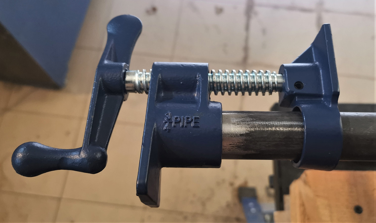 Также собрал пару трубных струбцин. Вообще уже довольно давно купил четыре штуки под трубу 3/4 и собственно сами трубы. Потом сломал клупп для нарезки резьбы, буквально пару оборотов смог сделать и все. В целом оказалось тяжелое дело нарезка резьбы, порядка часа уходит на одну трубу. Труба естественно не правильная, сварная и потом вовсе не цилиндрическая, болгаркой дорабатываю. Изначально хотел отдать токарю, но не смог найти их на даче.