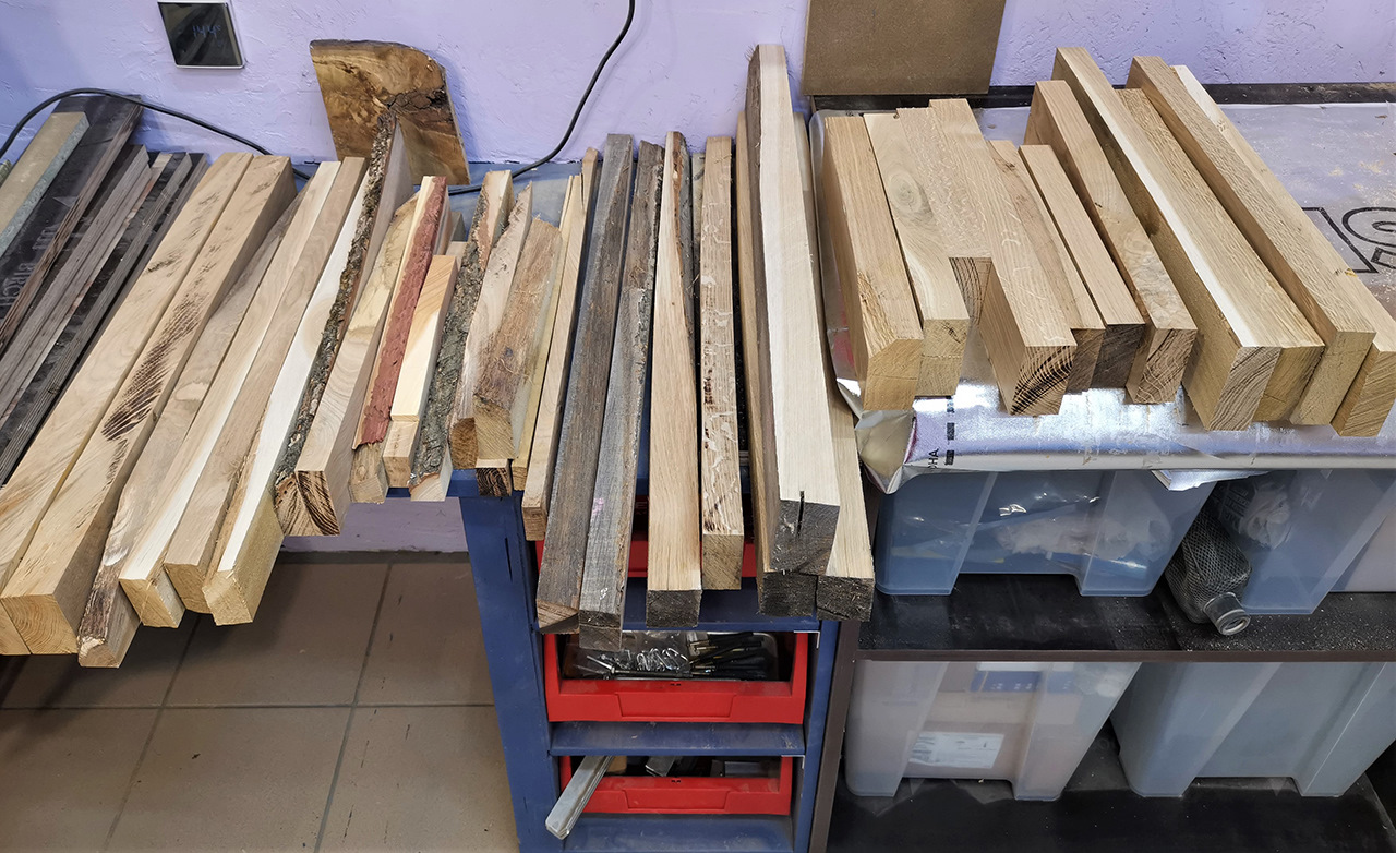 2. Что вы делаете с обрезками? Я помню, как мне уже говорили в комментах, что у дуба нет отходов. На фото специально разложил то что было не убрано, помимо них есть еще ящик с более короткими обрезками. В общем вопрос в большей степени по хранению. Длинные заготовки у меня на стеллажах. Совсем короткие в ящике. А вот средние, порядка 30-60см не понятно как хранить, причем не просто их куда то спрятать, а так чтобы всегда можно было оперативно выбрать и использовать, иначе они навечно будут похоронены.