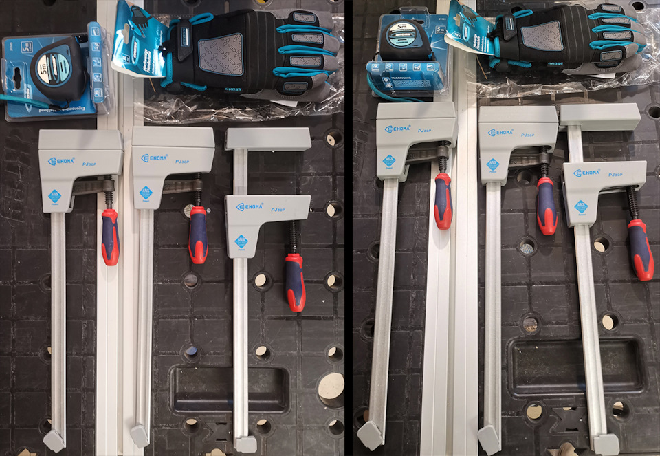 Специально разместил на фото обе струбцины, видно что все конструктивные элементы из металла. По характеристикам Гросс несколько шире (95мм против 80мм), шина у Гросс также толще ~ на 2мм. Ну и наверное основной момент, это рукоятки, ну Гросс она длинная и мощная, у EHOMA наоборот, короткая и тонкая, чтобы нельзя было сильно наваливать. Уже не первый раз вижу такой прием производителей, искуственно ограничить усилие пользователей на струбцину за счет небольшой ручки или короткого рычага. Из плюсов EHOMA, корпусной формат, ей заметно удобнее зажимать заготовки чем Гросс у которой относительно небольшой и скользкий рабочий пятак.