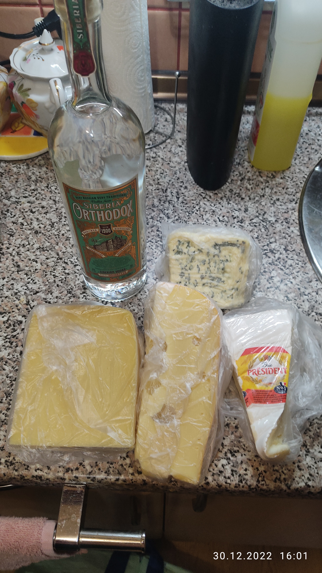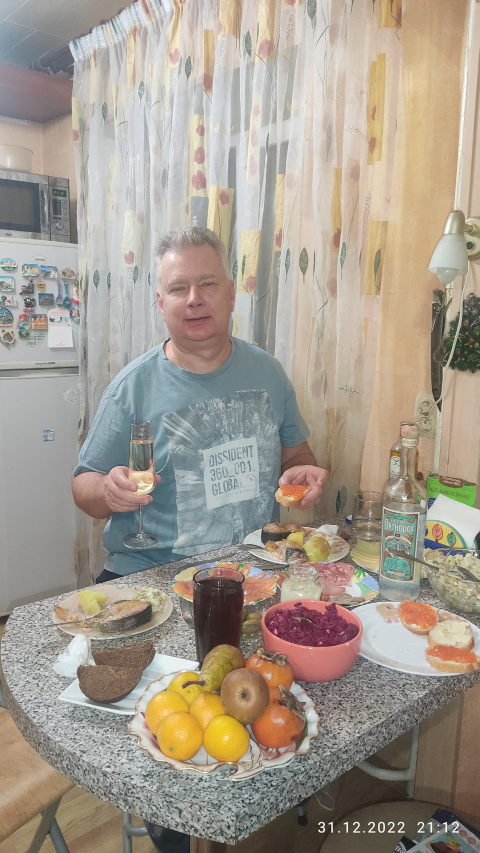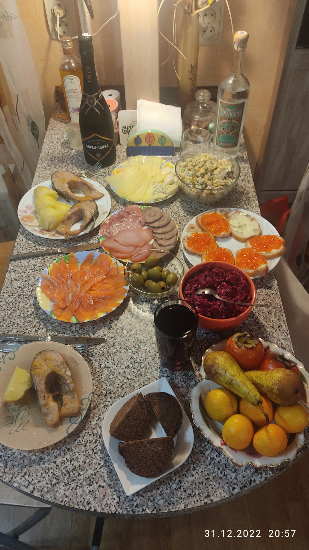 Конечно, салат оливье, но не с колбасой, а с говяжьим языком. Его купили и отварили накануне. Из салатов сделали ещё со свеклой, солёными огурчиками, чесноком, добавили в этот раз немного тёртого пармезана и кедровых орешек. Ещё люблю сам солить красную рыбу. Купил свежую карельскую форель, 2 куска посолил и три стейка для духовки. Зять подарил хорошую водку Siberia Ortodox и набор санкционного сыра :-) Долго искал красную икру, качественную и по нормальной цене, не дороже с 6 тыс рэ за кило. Купил по акции камчатскую в том же крупном сетевом магазине, что и форель.