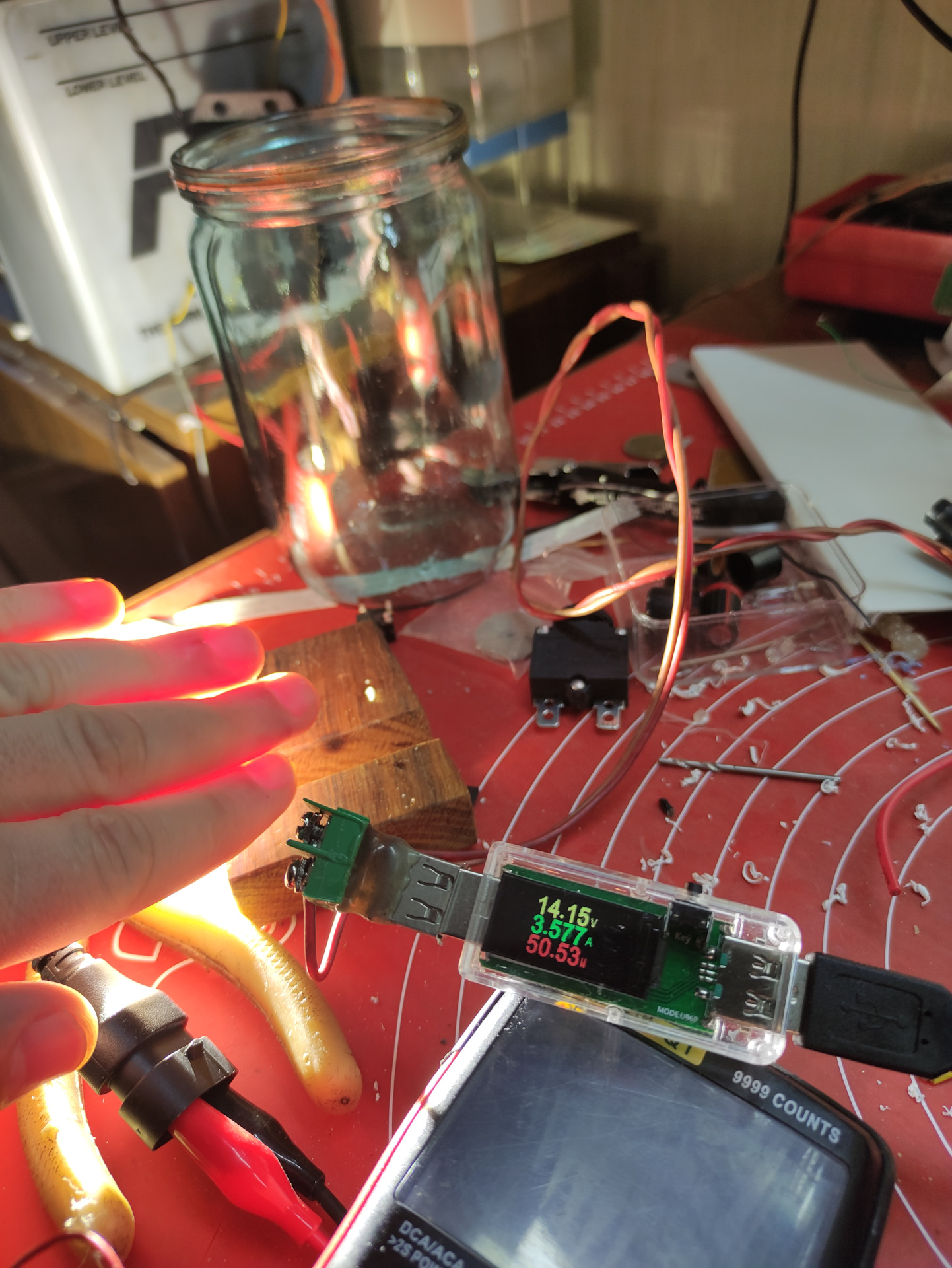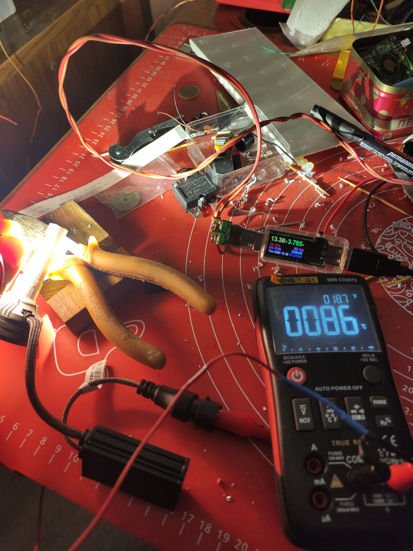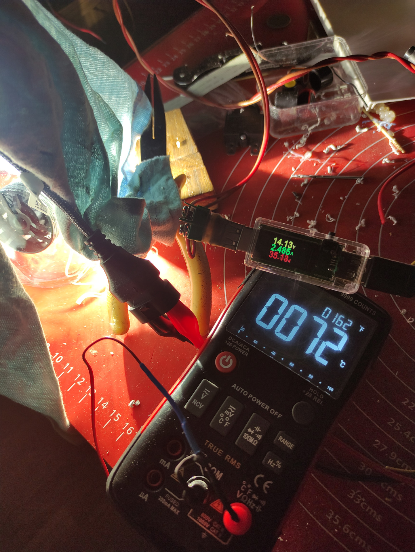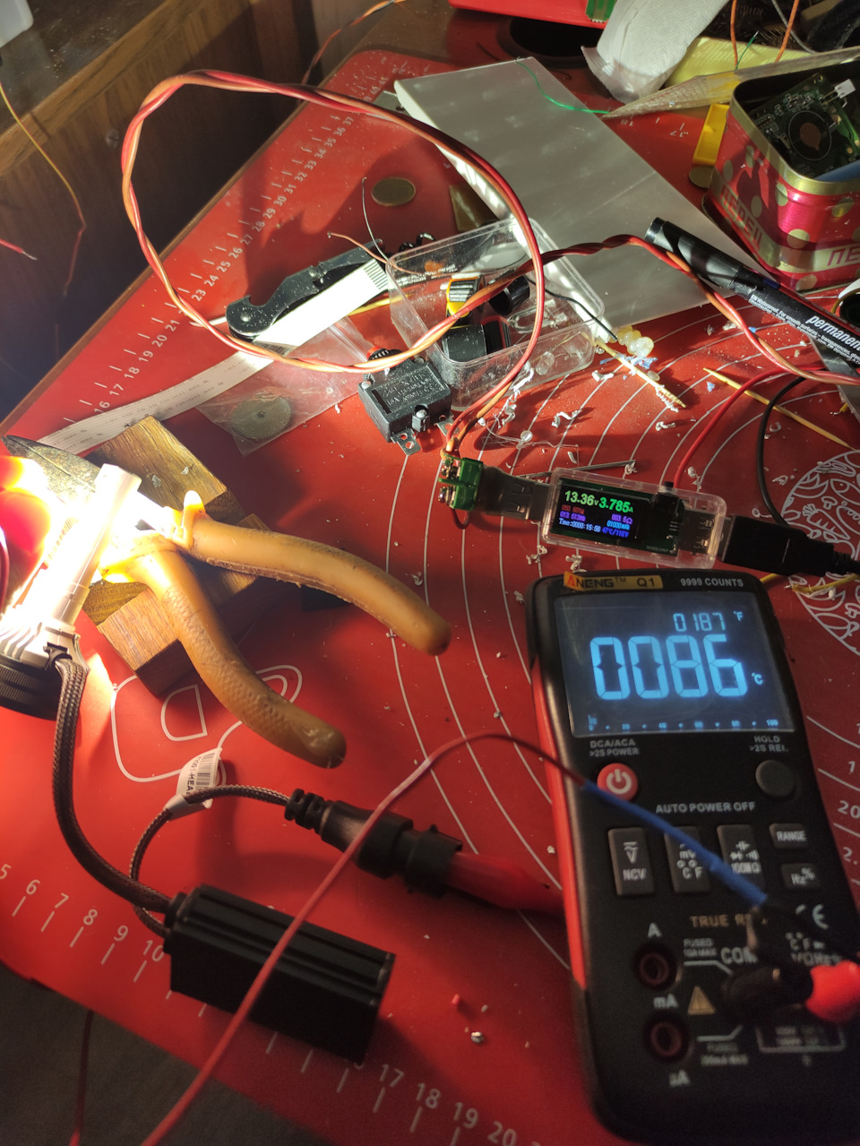 Начало испытания Напряжение 13.51 Вольт, Ток 3.8 Ампер, мощность 52 Ватт. Лампа работает на открытом воздухе.